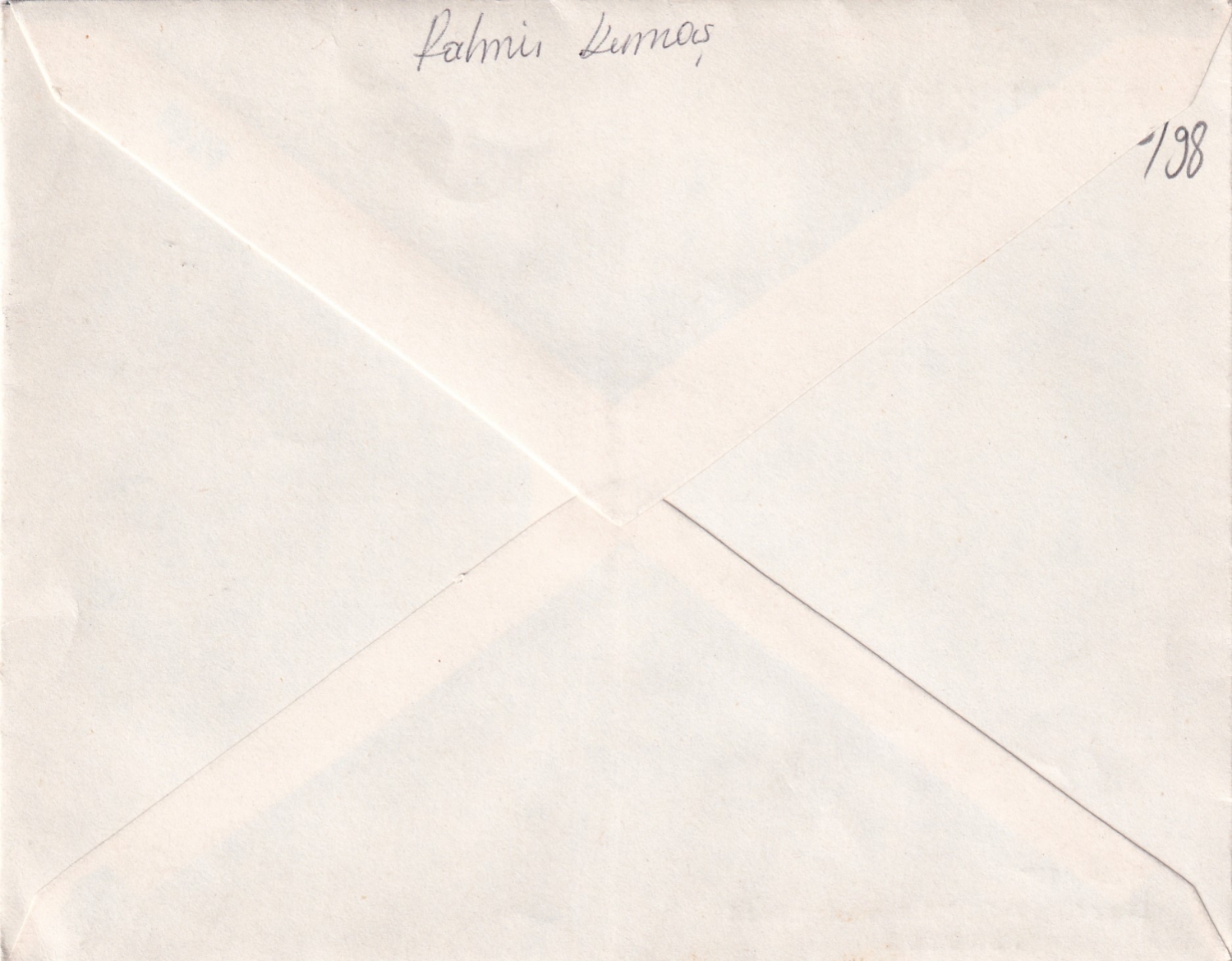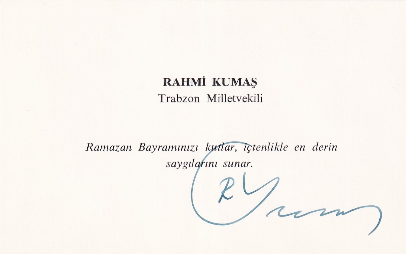 Avukat Rahmi Kumaş antetli zarf ve bayram tebrik kartı, imzalı, kart 12x7 cm