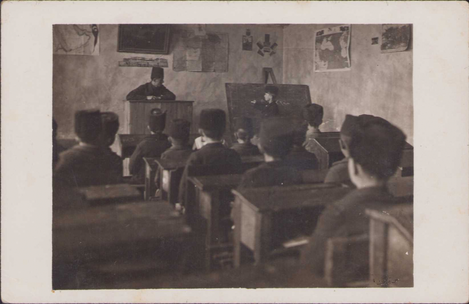 Osmanlı dönemi bir sınıf, muallim ve talebeler, fesli öğretmen önünde kara tahtaya yazı yazan öğrenci, harita detaylı
