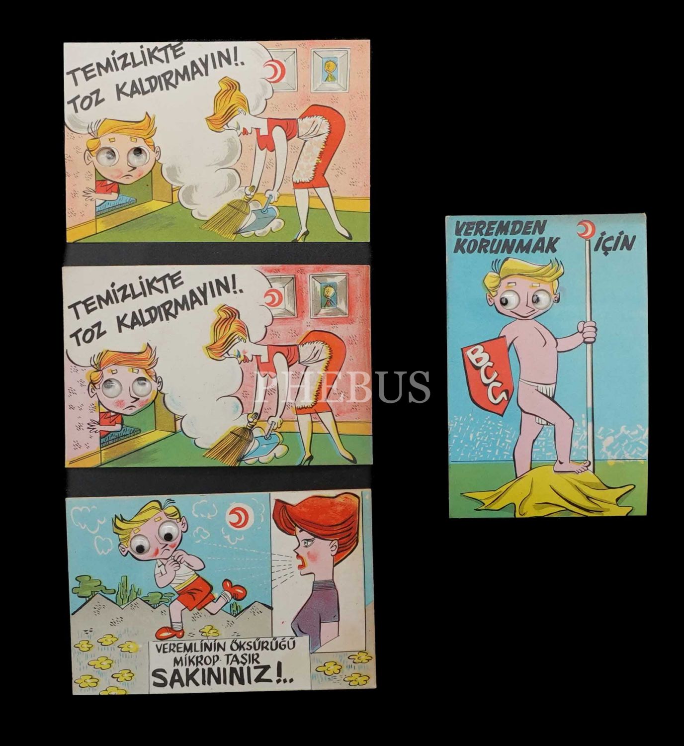 Türkiye Ulusal Verem Savaşı Derneği tarafından yayımlanan, vereme karşı tedbirler konulu 4 adet kartpostal, 14x9 cm...