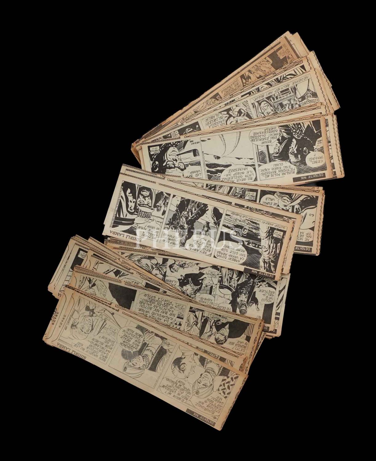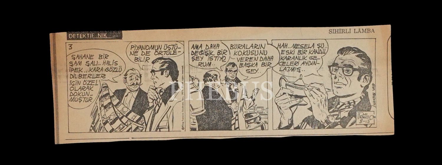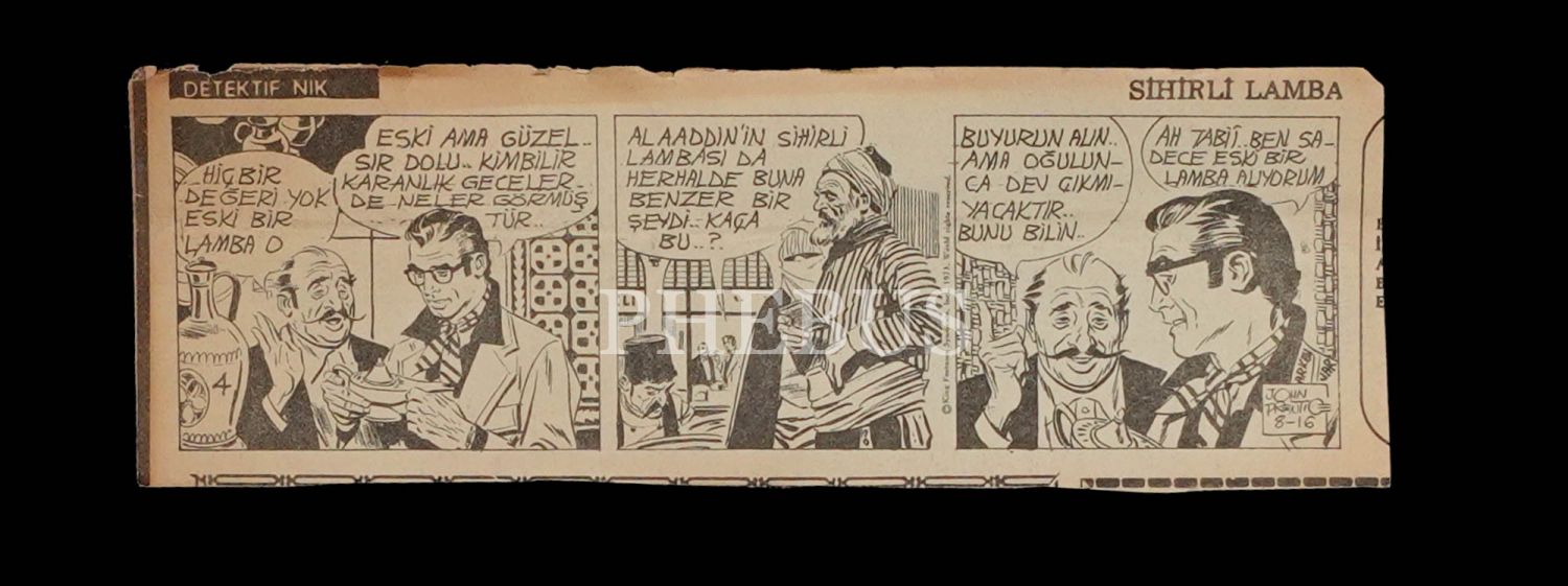 Dedektif Nik´in bir gazetede yayımlanan "Sihirli Lamba" macerasının bant çizimleri, 83 yaprak, 21x7 cm...