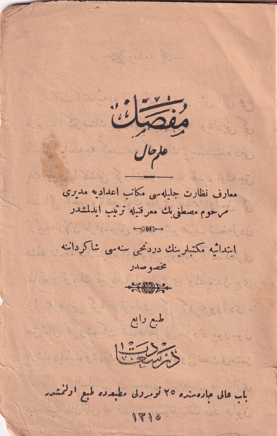 Osmanlıca Mufassal İlmihal - ibtidai mektebi dördüncü sınıf şakirdanelerine mahsus, dördüncü baskı, Bab-ı Ali Caddesi 25 numaralı Matbaa, Dersaadet, 1315, 40 sayfa, 11x16 cm