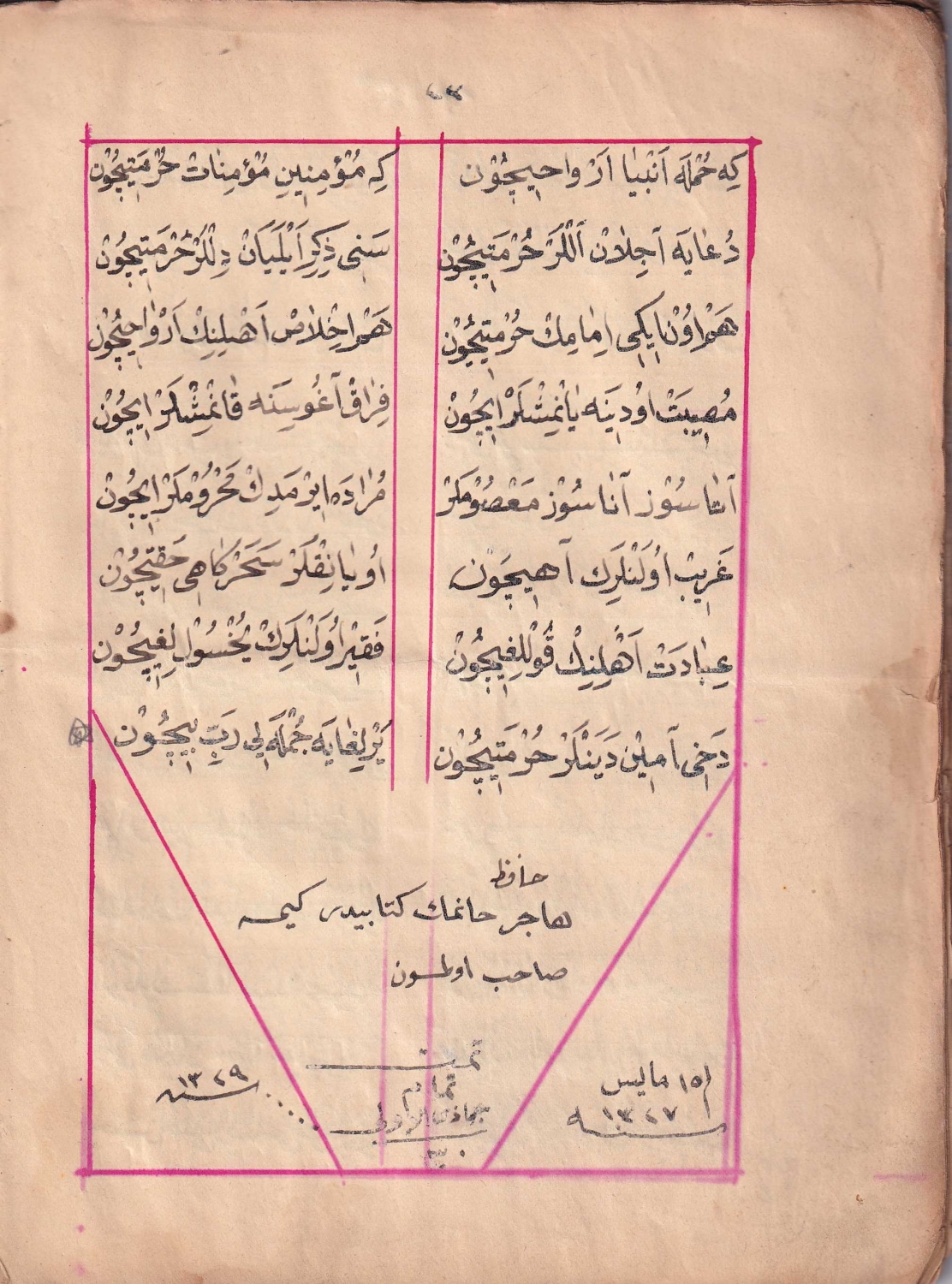 Kitabın sonunda 'Hafız Hacer Hanımın kitabıdır, kimse sahip olmasın' notu var