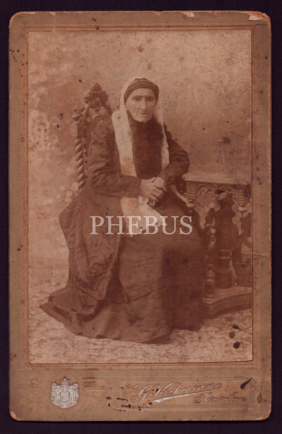 Yaşlı bir hanımefendinin stüdyo hatıra fotoğrafı, G. Krikorian, Palestina, Jerusalem (Filistin, Kudüs), 11x17 cm...