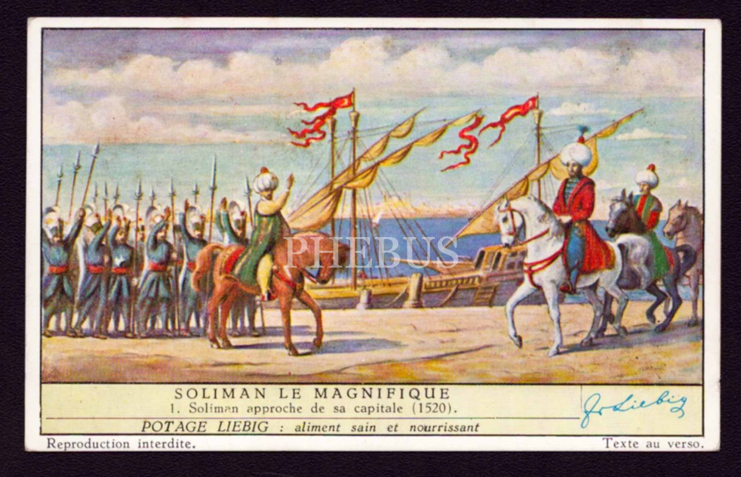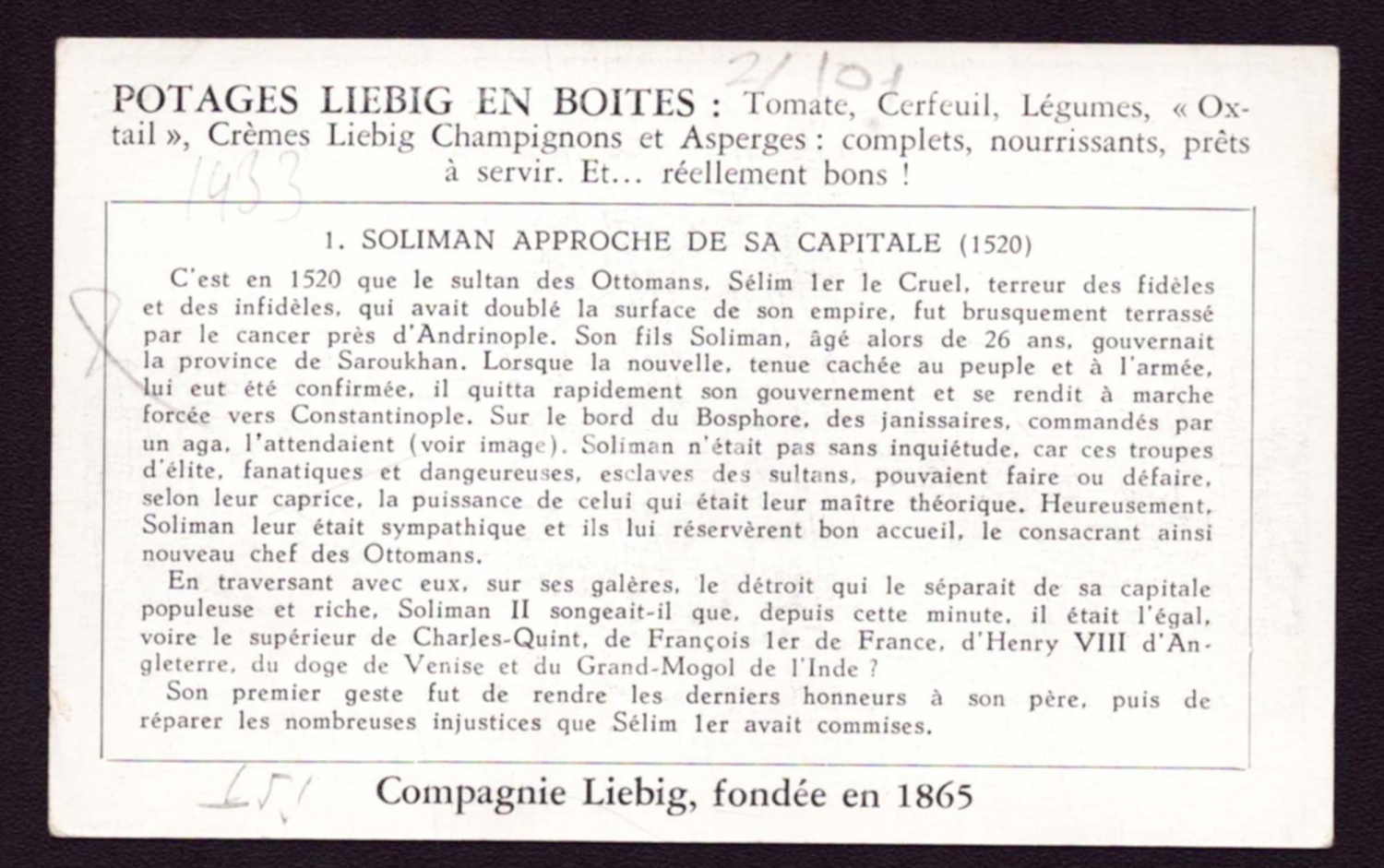 "Compagnie Liebig" markasının Osmanlı pazarı için hazırladığı, Kanuni Sultan Süleyman görselli çorba kartı, 11x7 cm...
