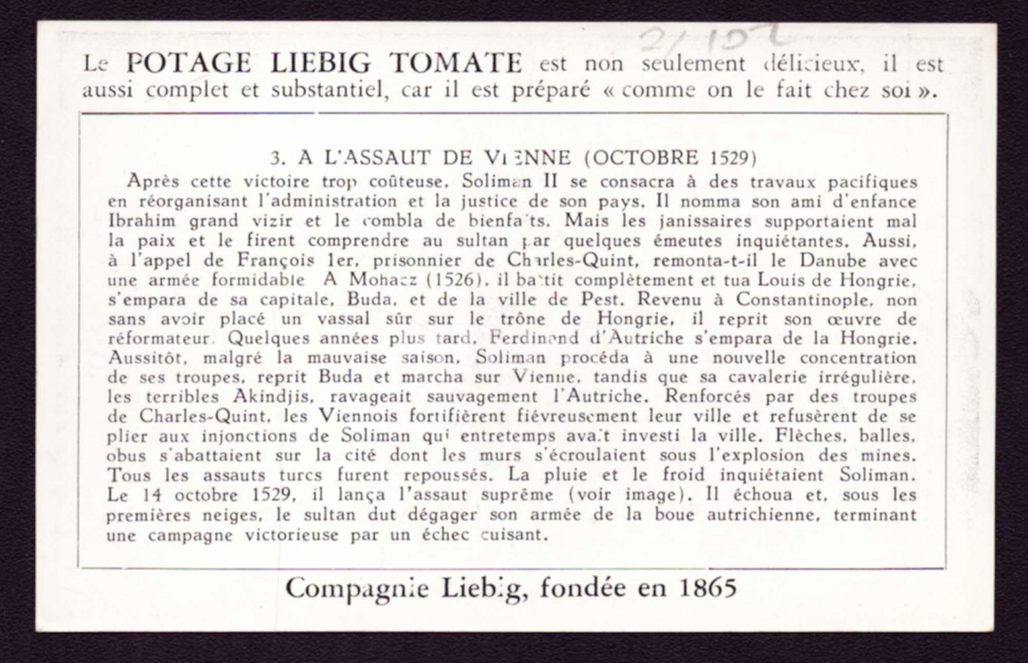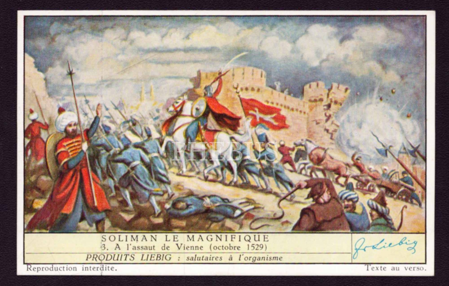 "Compagnie Liebig" markasının Osmanlı pazarı için hazırladığı, Kanuni Sultan Süleyman´ın Viyana Kuşatması görselli çorba kartı, 11x7 cm...
