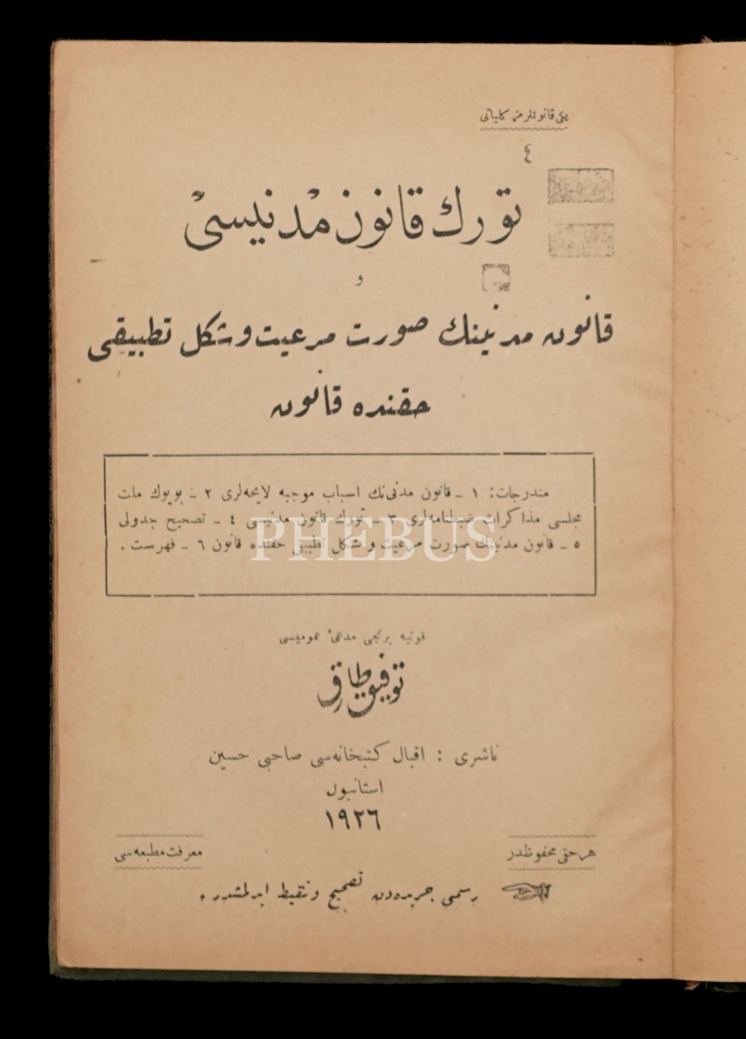 TÜRK KANUN-İ MEDENİSİ, Tevfik Tarık, 1926, Marifet Matbaası, 195 sayfa, 14x20 cm...