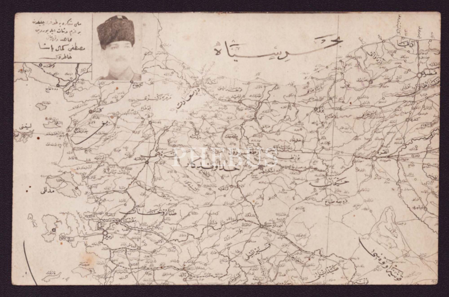 "Milli Mefkureye doğru çelikden bir azim ve sabat ile yurdun mücahid ve kahramanı Mustafa Kemal Paşa hatırası" yazılı Atatürk ve Türkiye haritası görselli kartpostal, 14x9 cm...