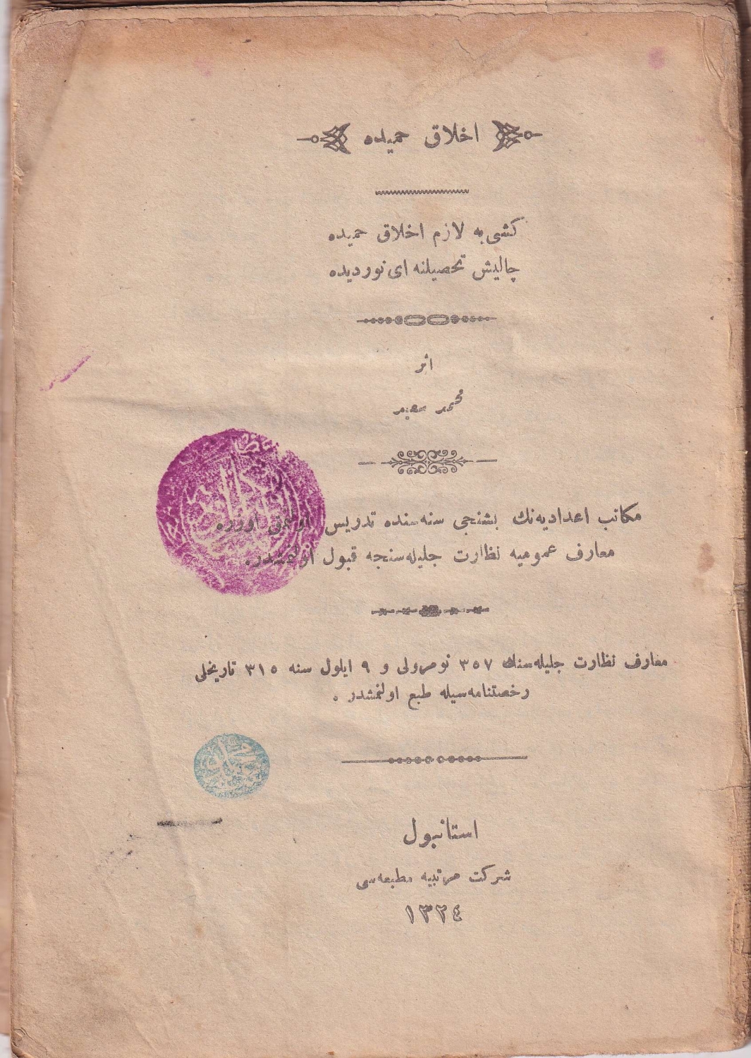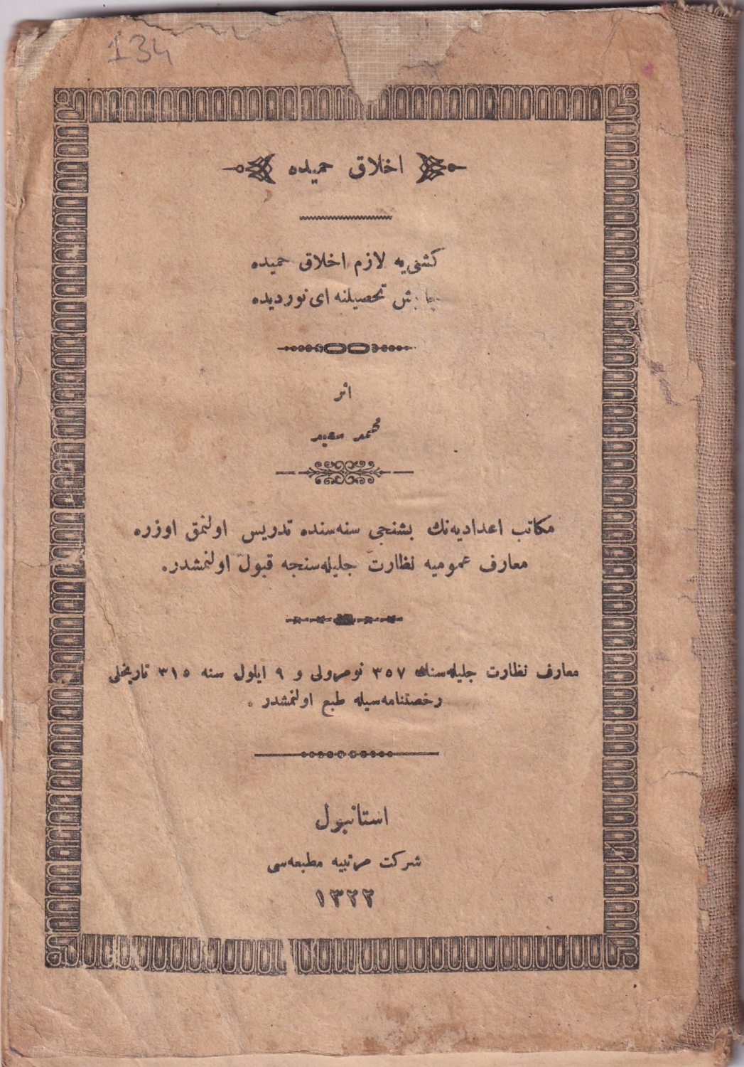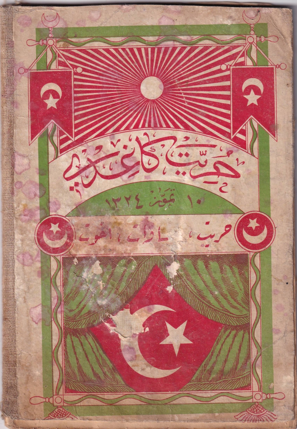 Osmanlıca bir yüzü Hürriyet Kağıdı Meşrutiyet diğer yüzünde cilt Ahlak-ı Hamidiye kitabı cildi, Mehmed Said, Şirket-i Mürettebiye Matbaası, 1322, 96 sayfa, 14x20 cm
