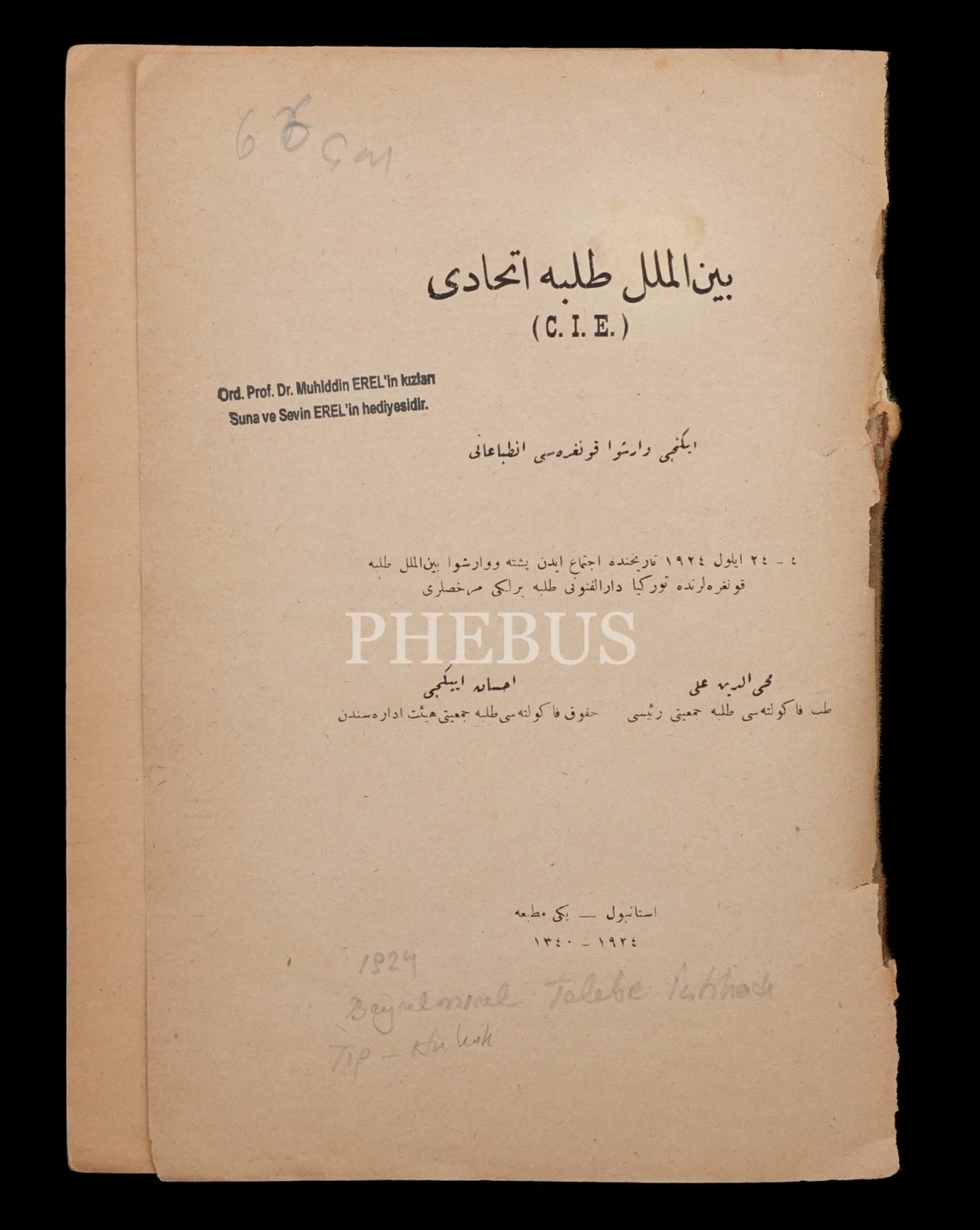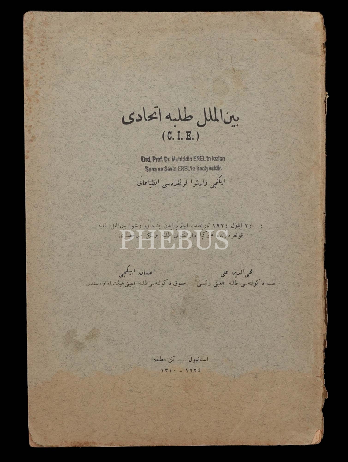 Kitabın kapak sayfasında, Ord. Prof. Dr. Muhiddin Erel´in kızları Suna ve Sevin Erel´in hediyesidir" yazılı kaşe vardır.