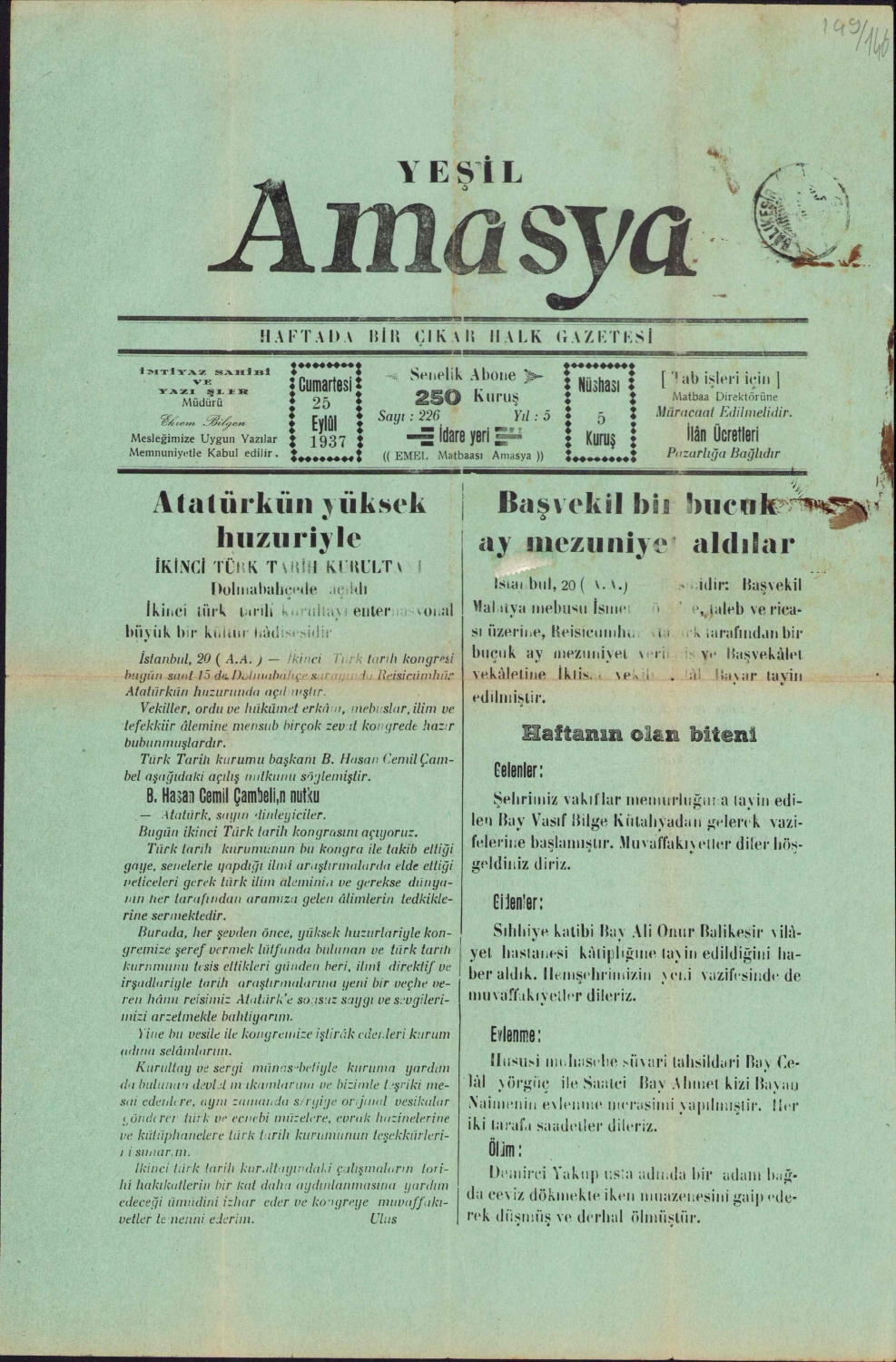 Yeşil Amasya gazetesi, 1937, "Atatürkün yüksek huzuriyle ikinci Tür Tarih Kurultayı Dolmabahçe de açıldı", 28x40 cm