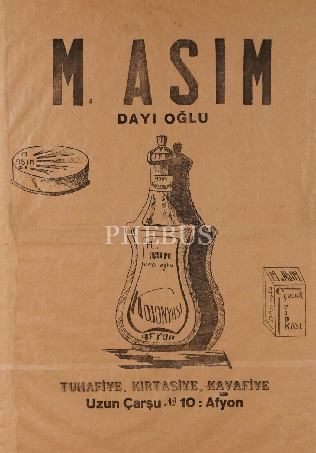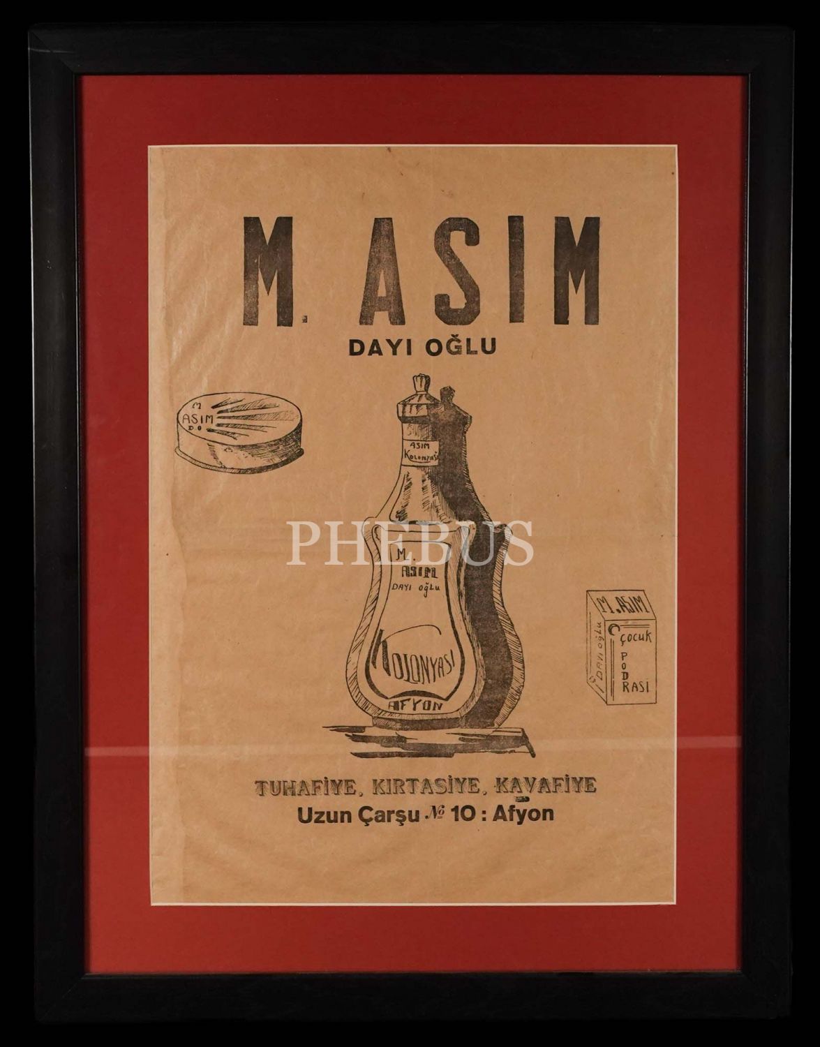 Erken Cumhuriyet döneminden Afyonkarahisar merkezli "Tuhafiye, Kırtasiye, Kavafiye" mağazası M. Asım Dayı Oğlu´ya ait afiş, çerçevesiyle birlikte 48x63 cm...