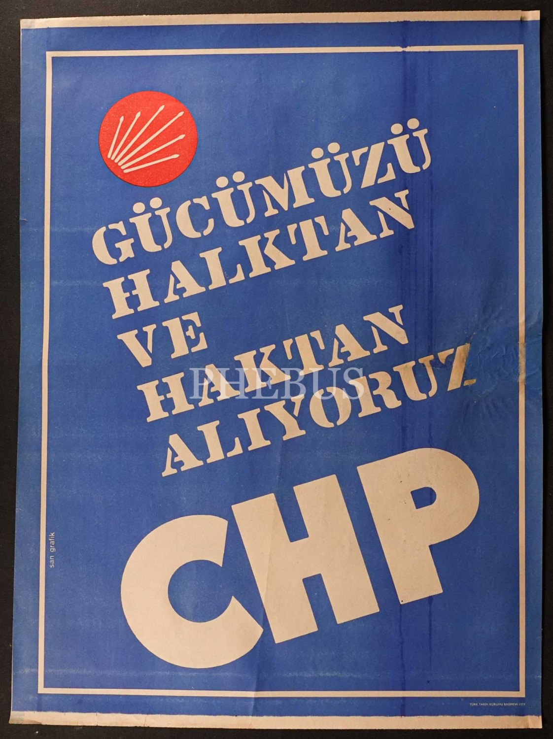 "Gücümüzü Halktan ve Haktan Alıyoruz" sloganlı CHP propaganda afişi, San Grafik, Türk Tarih Kurumu Basımevi, 1977, 49x67 cm...