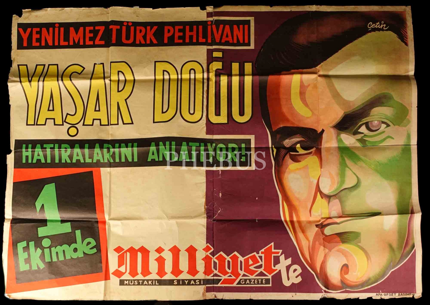 "Yenilmez Türk Pehlivanı Yaşar Doğu Hatıralarını Anlatıyor!" sloganlı Milliyet gazetesi duyuru afişi, Apa Ofset, 135x99 cm...