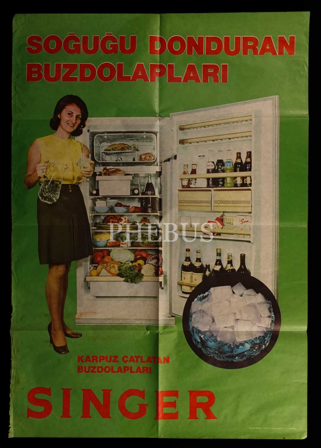 SINGER marka buzdolabı afişi, "Soğuğu Donduran Buzdolapları / Karpuz Çatlatan Buzdolapları", Reklam Moran - Kâğıt ve Basım İşleri A.Ş., 48x69 cm...
