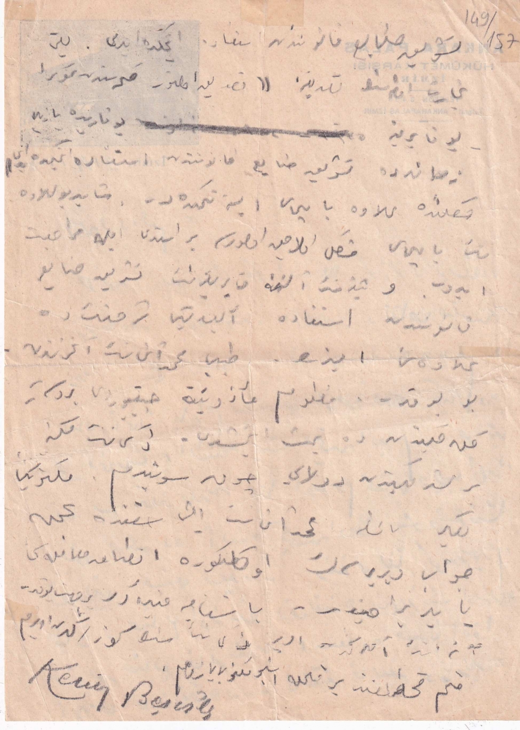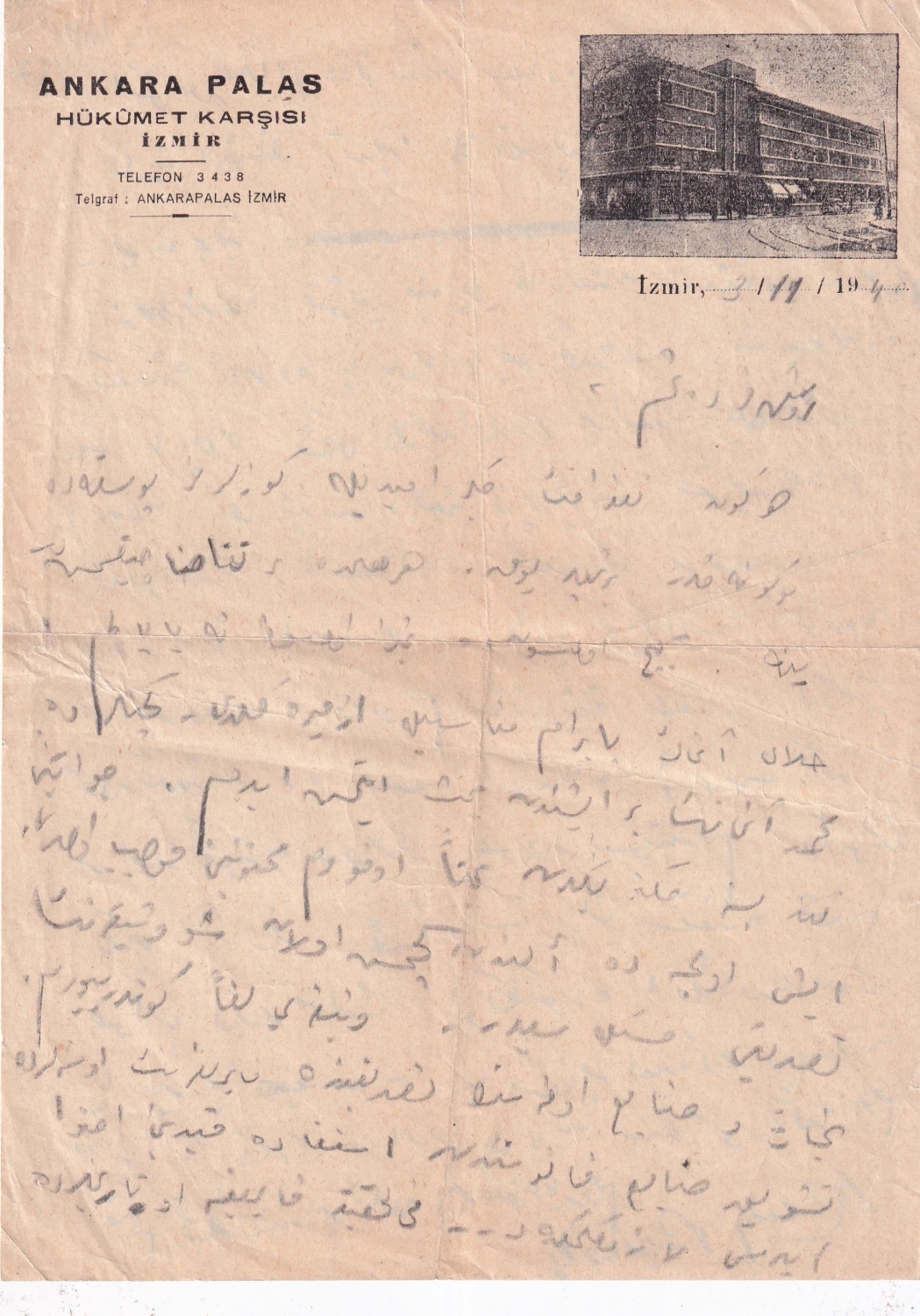 Ankara Palas Hükümet Karşısı İzmir antetli Osmanlıca yazılı doküman, 16x23 cm