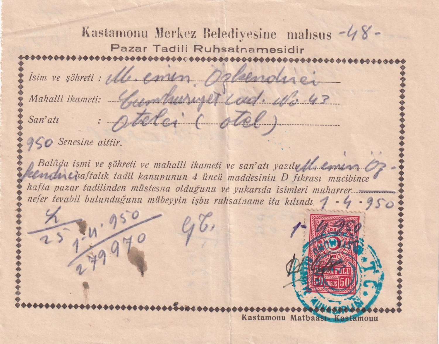 Katamonu Merkez Belediyesine mahsus pazar tadili ruhsatnamesidir, 1950, 12x16 cm