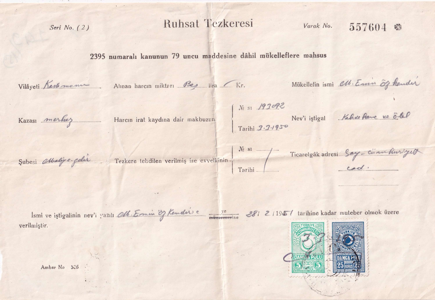 Kastamonu merkeze ait ruhsat tezkeresi, 1951, 26x18 cm