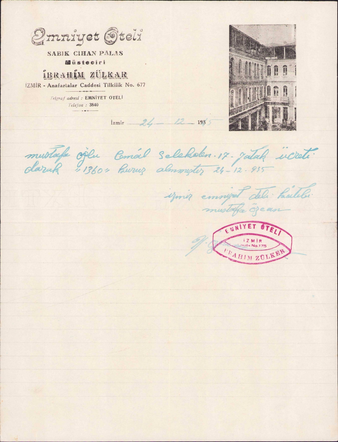 Emniyet Oteli Sabık Cihan Palas, İzmir antetli damgalı doküman, 20x30 cm