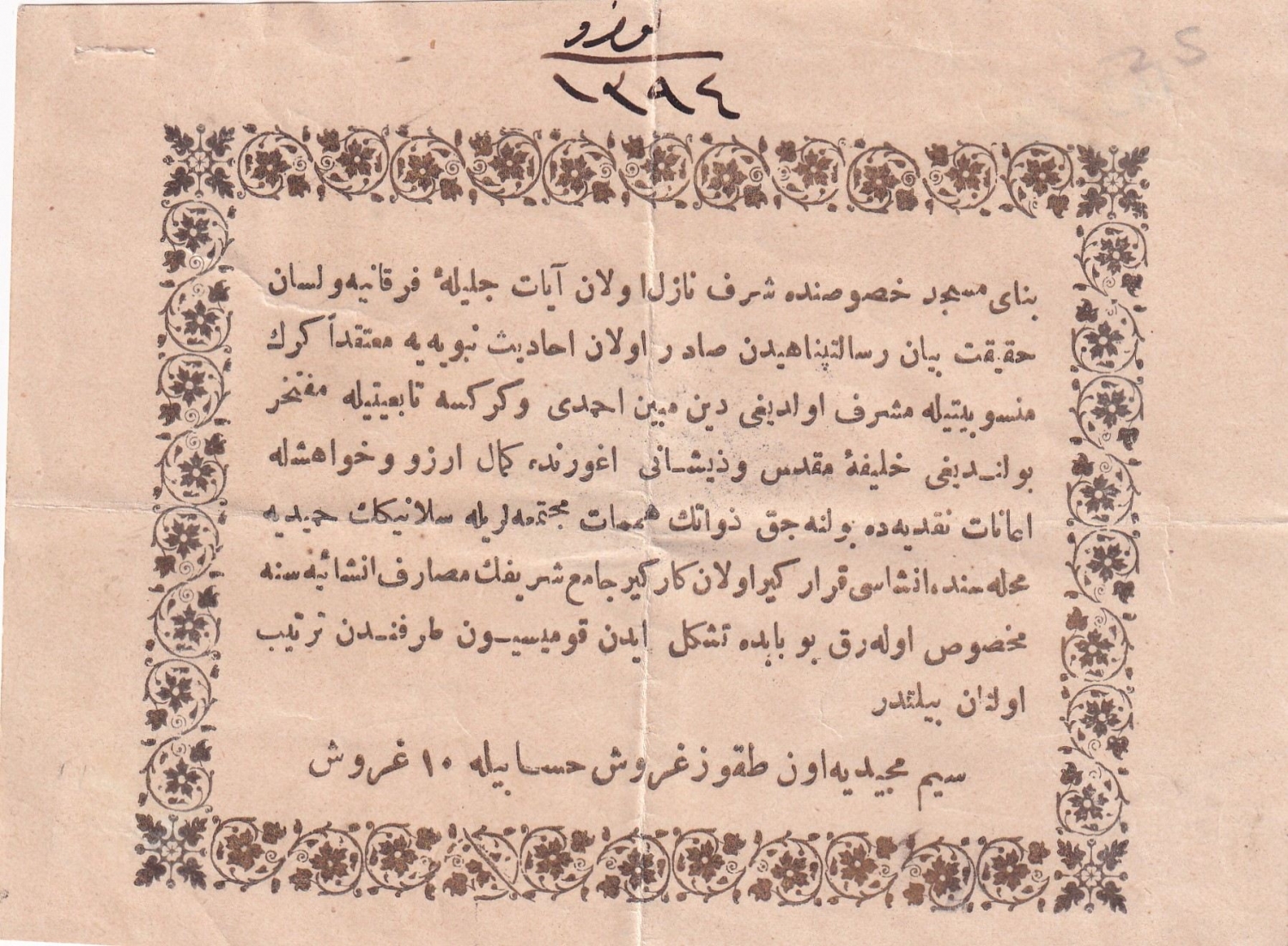 Osmanlıca Selanik Hamidiye Mah'deki caminin inşası için yardım bileti, 15x12 cm