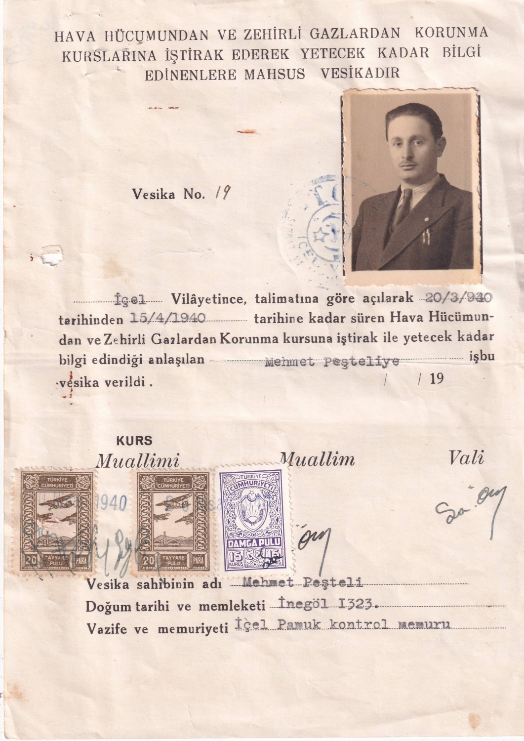 Hava hücumundan ve zehirli gazlardan korunma kurslarına iştirak ederek yetecek kadar bilgi edinenlere mahsus vesika, 1940, 16x22 cm
