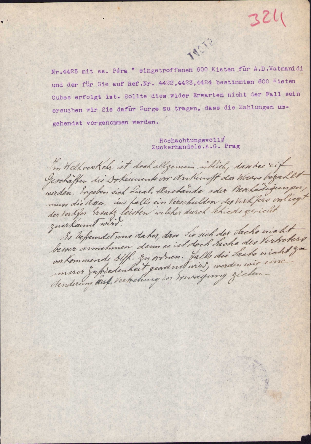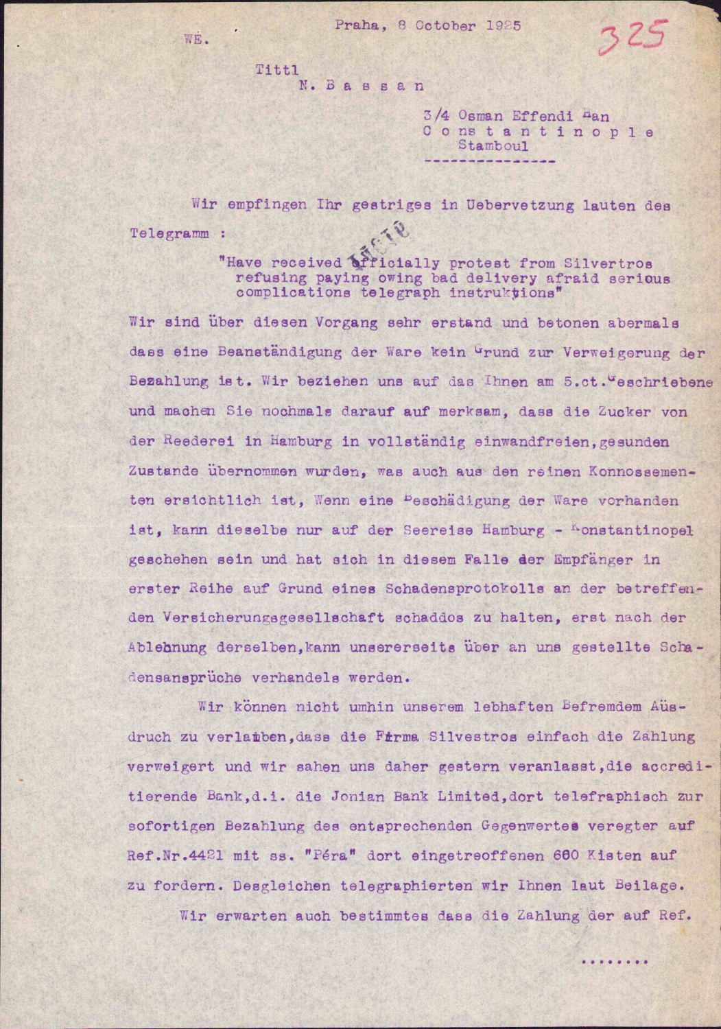 Osman Efendi hanında Şeker Komisyoncusu N. Bosson efendiye Berlin Şeker Ticareti A.Ş. ye ihraç ettiği şekerler ile ilgili Almanca evrak ve Osmanlıca tercümesi, 1925, 20x32 cm