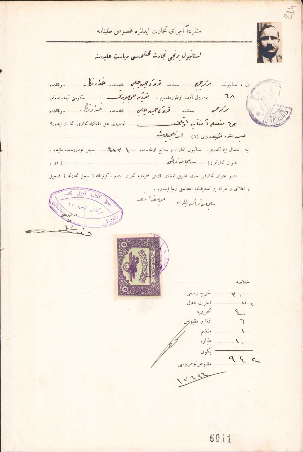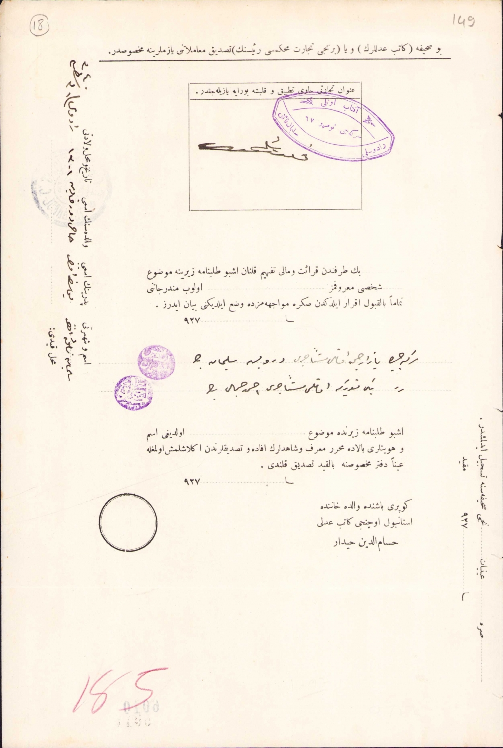 Osmanlıca Talepname Sirkeci Karaki Hüseyin Çelebi mah. Hüdavendigar sok. 68 numaralı Afitab Oteli sahibi Süleyman Faikin tatbik-i imzası Afitab oteli mühürlü, Tayyare pullu, 1927, 20x31 cm