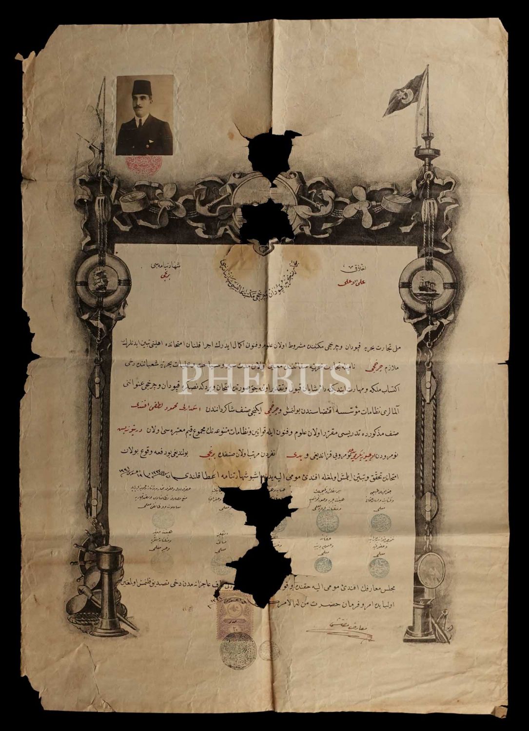 Cihan Harbi döneminden 1331-32 tarihli Ticaret ve Çarhcı Kapudan Mektebi kaptanlık diploması, 49x34 cm...