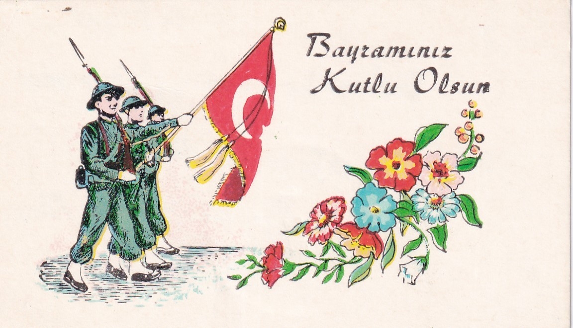 Türk bayrağı ve asker görselli bayram tebrik kartı,10x6 cm