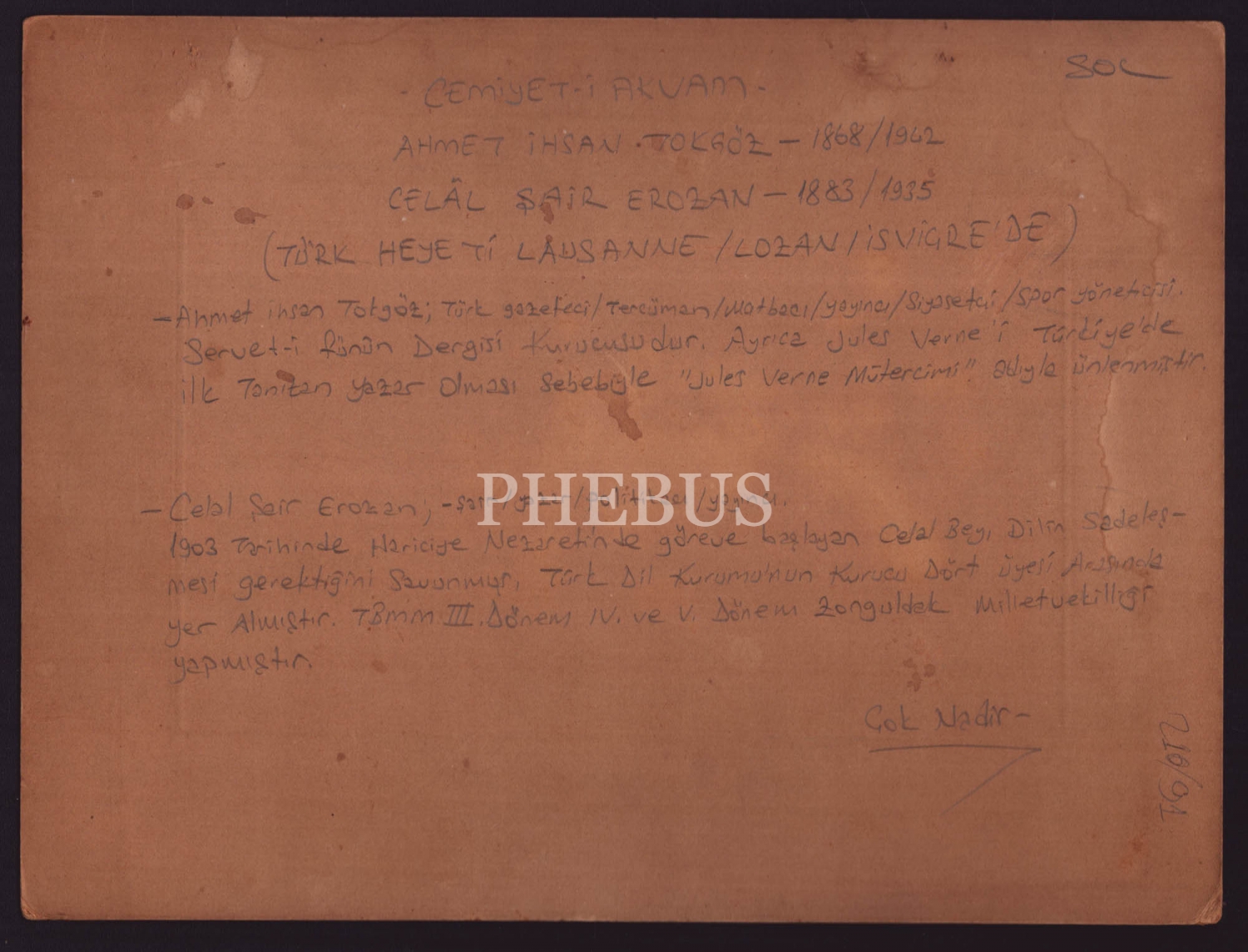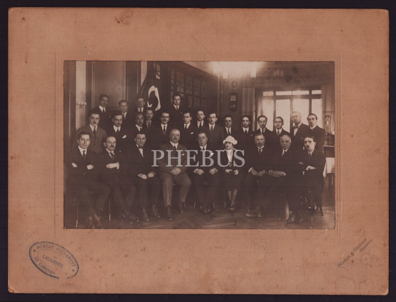 Aralarında Ahmet İhsan Tokgöz ile Celal Sair Erozan´ın da bulunduğu Türk heyetinin Lozan´da, Cemiyet-i Akvam´da (Milletler Cemiyeti) aldırdığı hatıra fotoğrafı, paspartusuyla birlikte 32x24 cm...