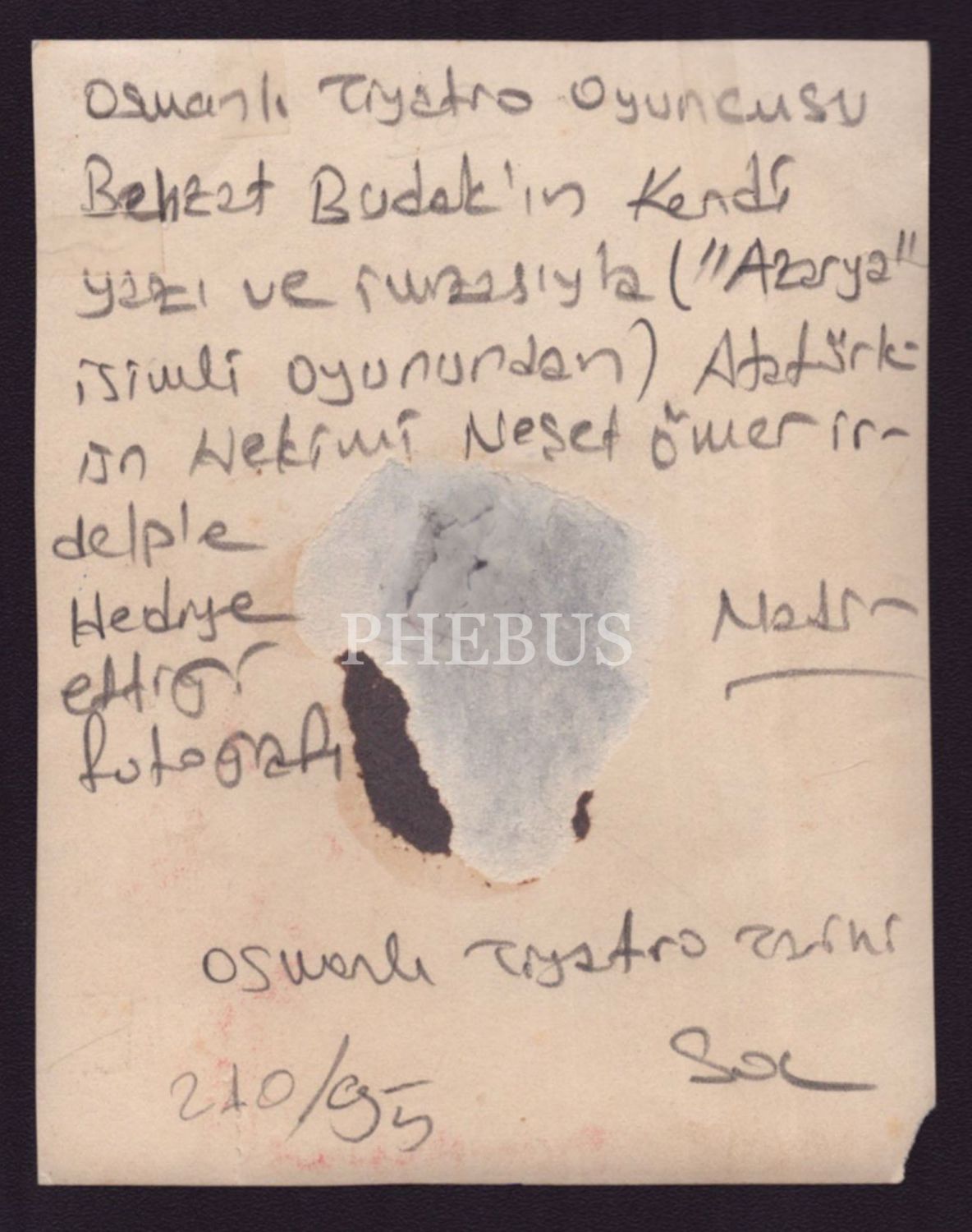 Osmanlı döneminin meşhur tiyatro oyuncularından Behzat Budak´ın, Mustafa Kemal Atatürk´ün doktoru Neşet Ömer İrdelp´e ithaflayıp imzaladığı fotoğrafı, 9x12 cm...