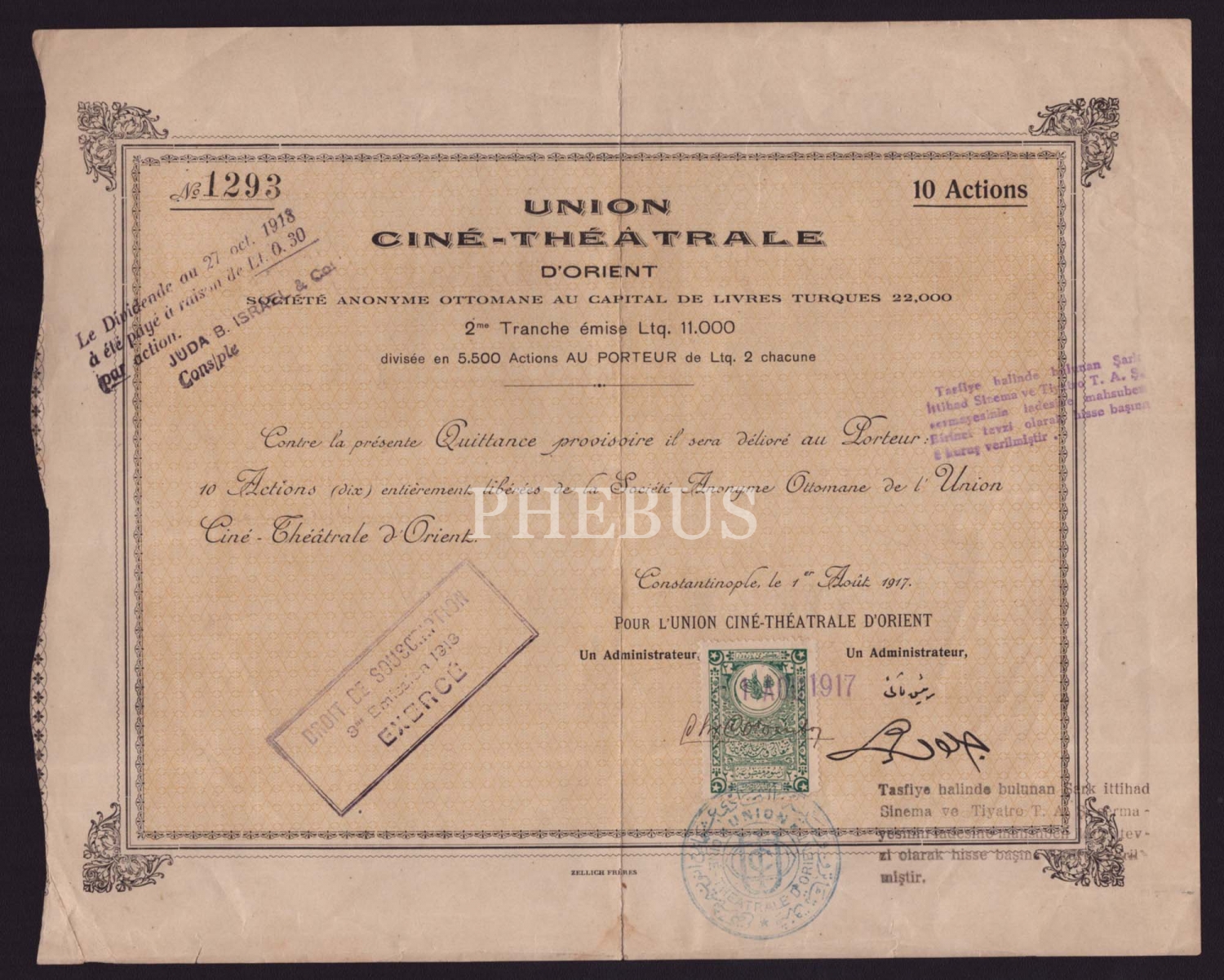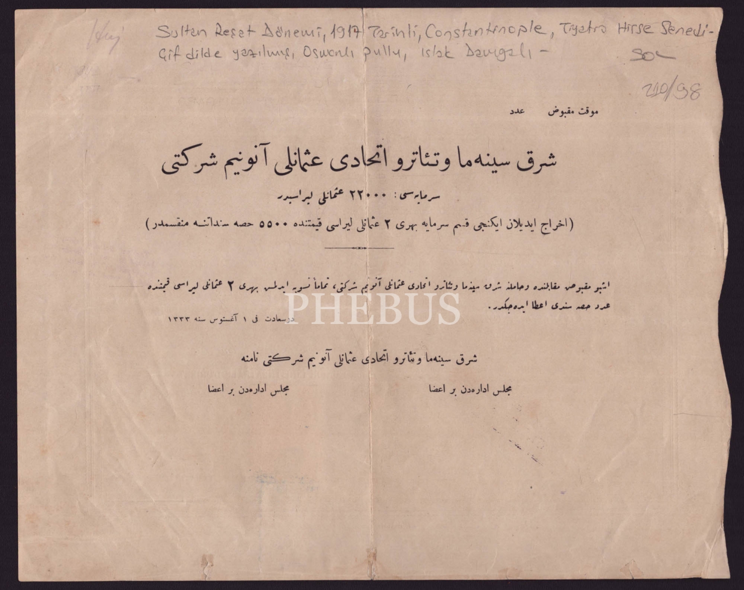 1917 tarihli Şark İttihad Sinema ve Tiyatro T.A.Ş. (Union Cine-Theatrale d´Orient) hisse senedi, Osmanlıca-Fransızca yazılı, pullu-damgalı, 28x22 cm...