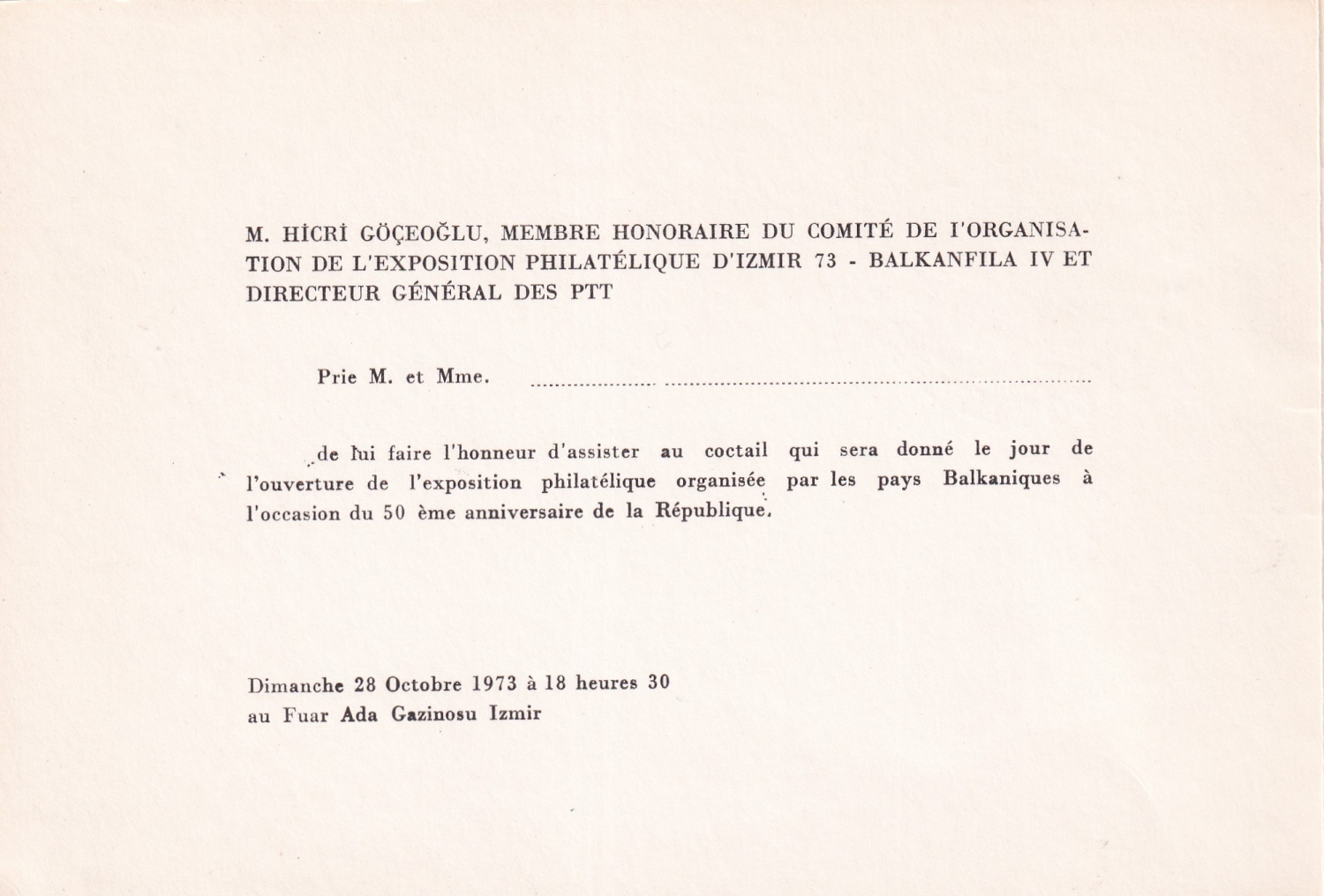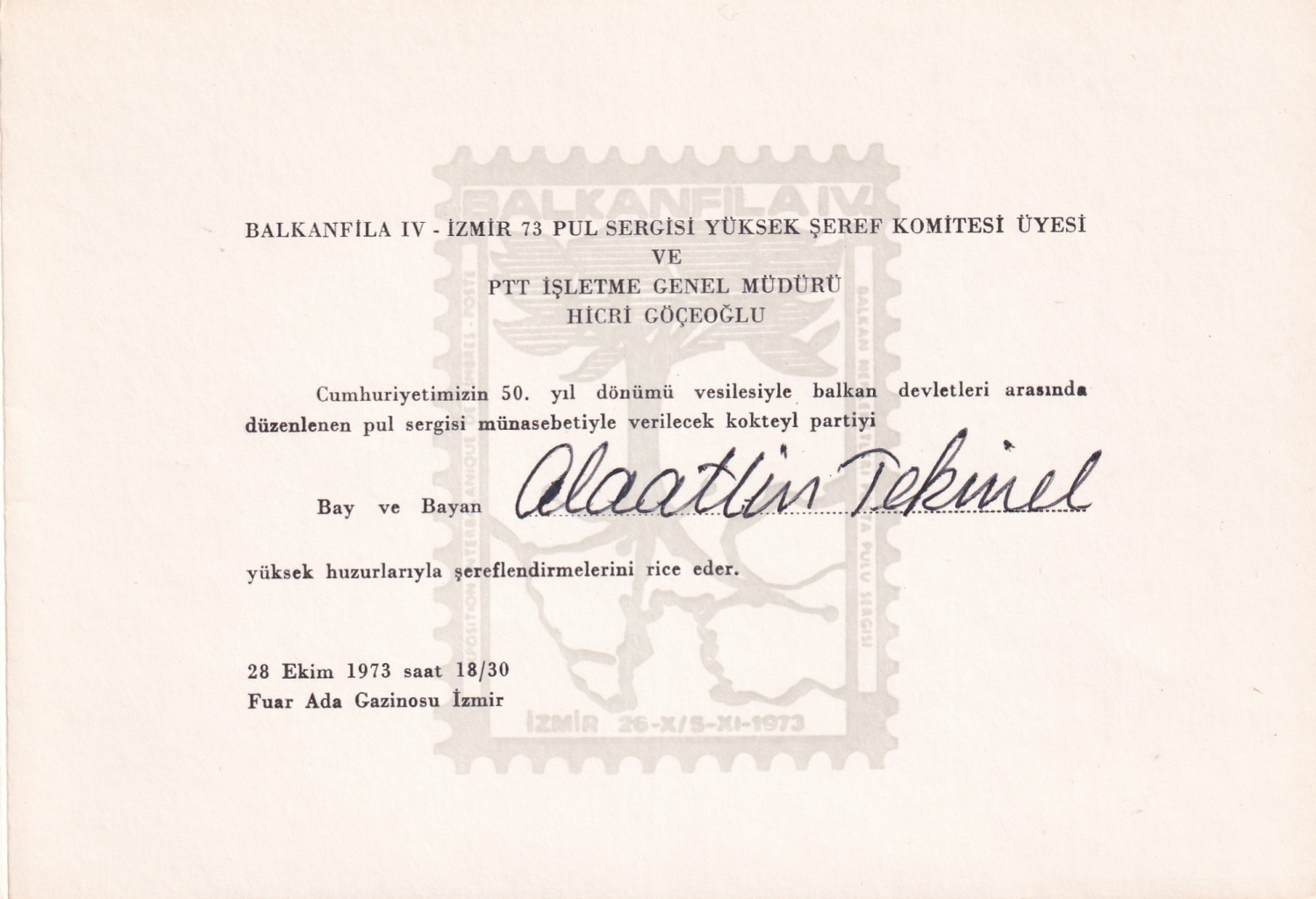Cumhuriyetin 50. yıl dönümü münasebetiyle balkan devletleri arasında düzenlenen pul sergisi münasebetiyle vereceği kokteyl parti davetiyesi, 1973, 17x10 cm