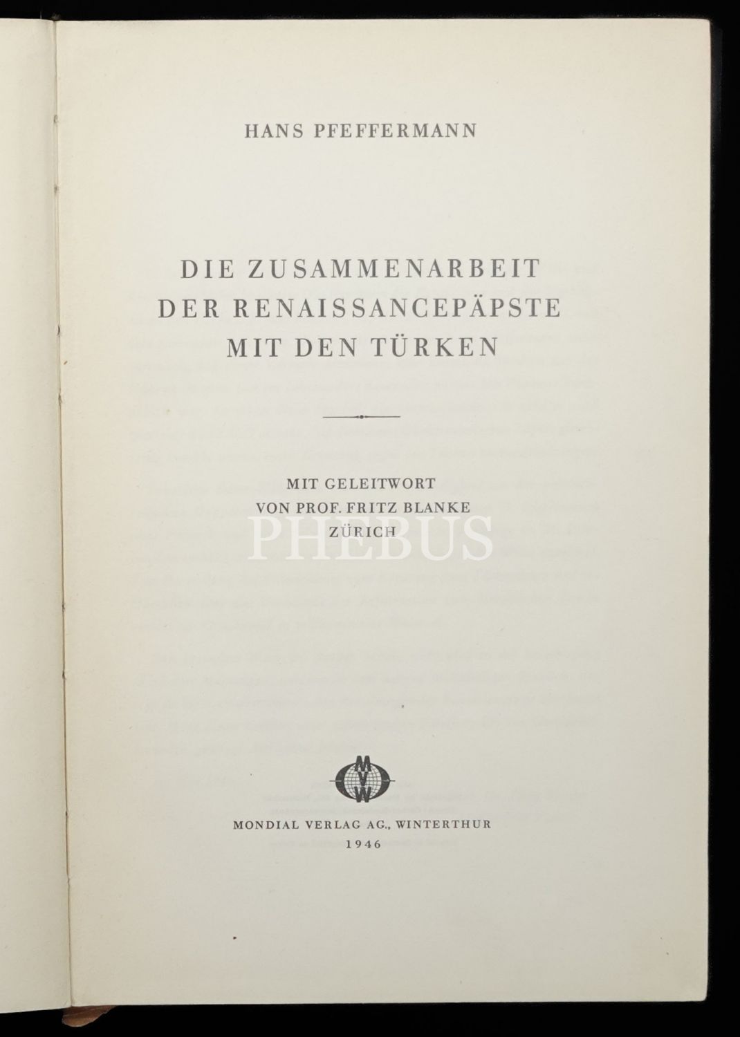 DIE ZUSAMMENARBEIT DER RENAISSANCEPAPSTE MIT DEN TÜRKEN, Hans Pfeffermann, 1946, Mondial Verlag AG., Winterthur, 256 sayfa, 16x24 cm...