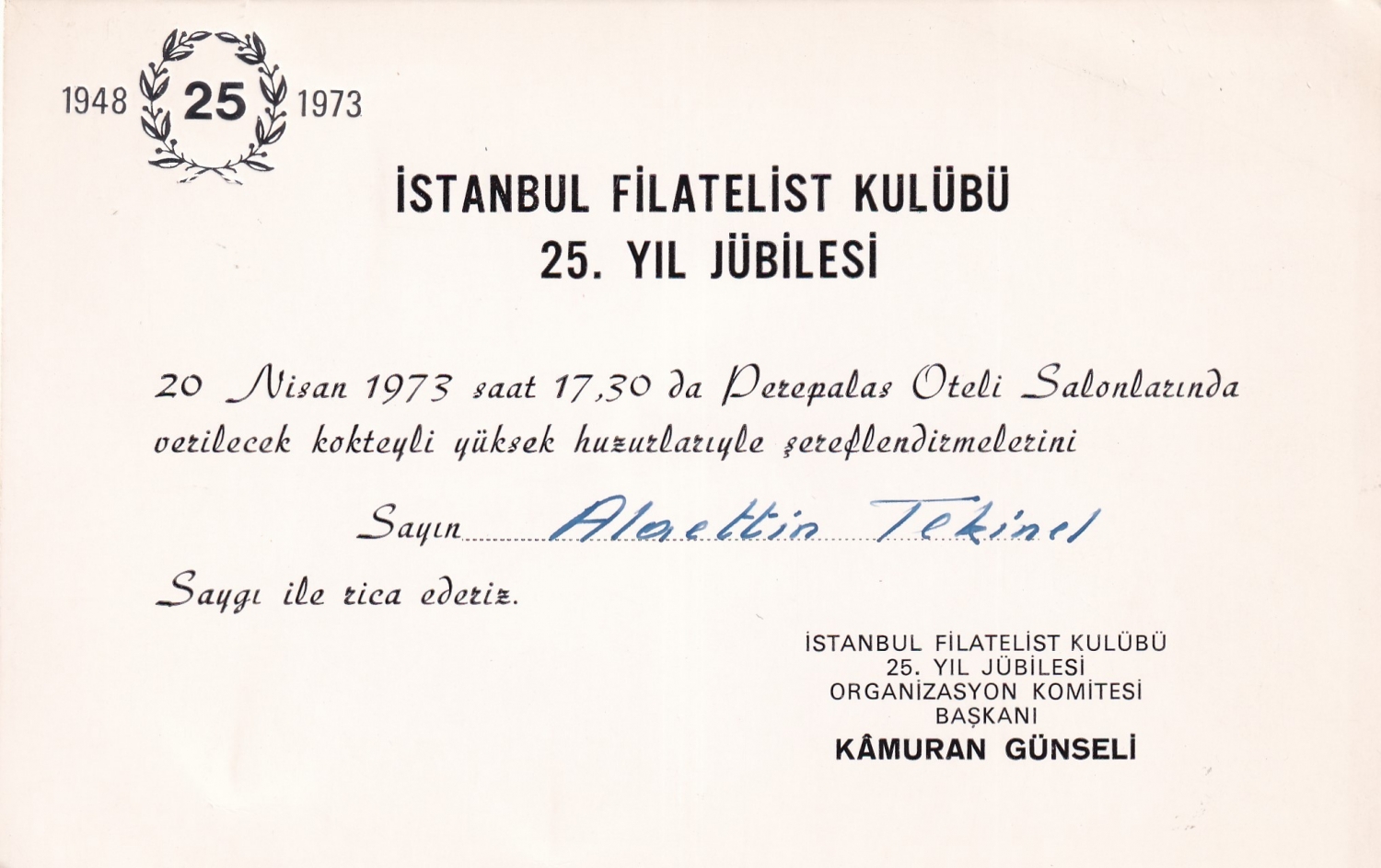 İstanbul Filatelist Kulübü 25. Yıl Jübilesi kokteyl davetiyesi, 17x10 cm