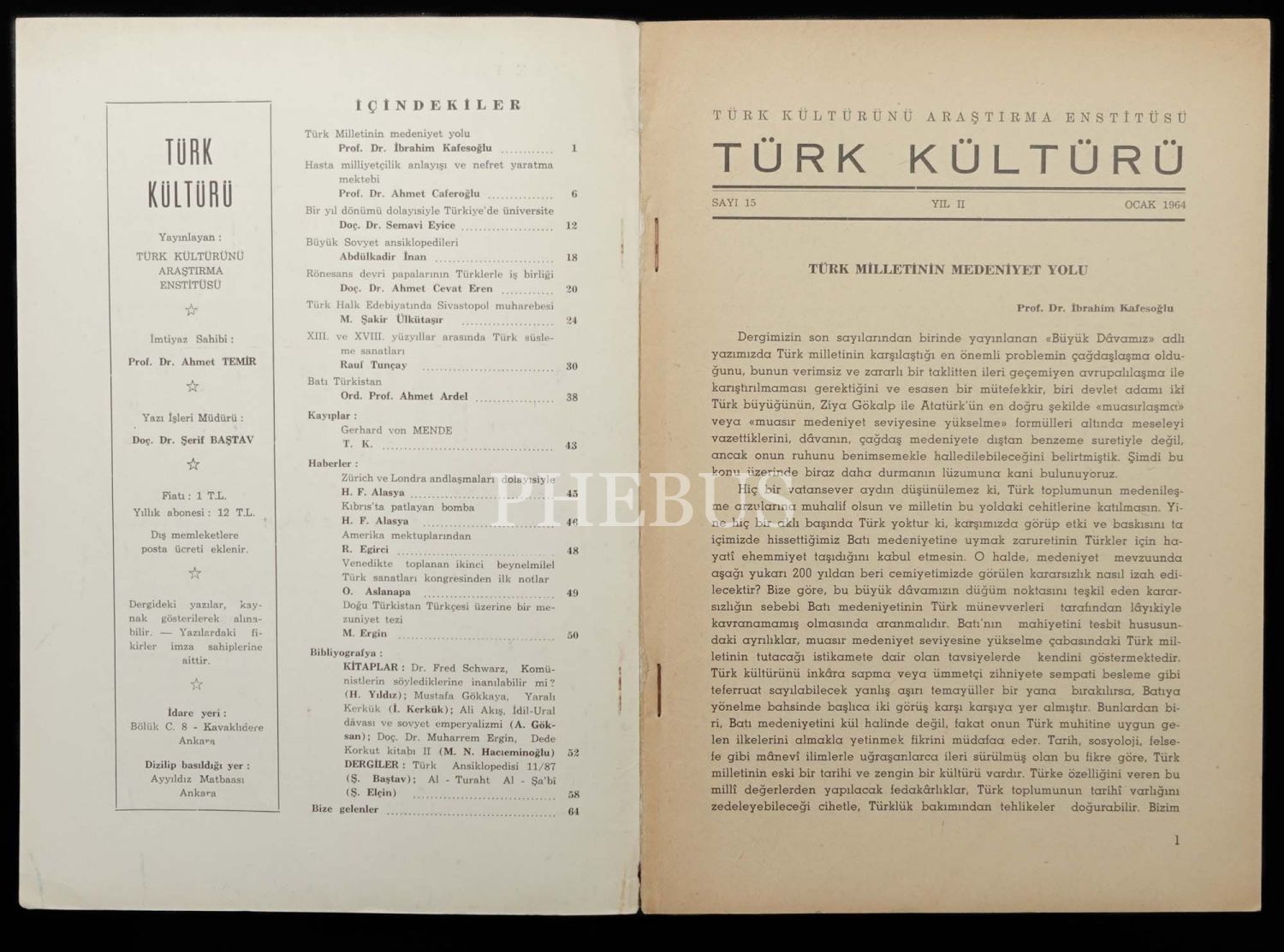 TÜRK KÜLTÜRÜ, Ocak 1964, Türk Kültürünü Araştırma Enstitüsü, Ayyıldız Matbaası Ankara, Sayı 15, 64 sayfa, 17x24 cm...