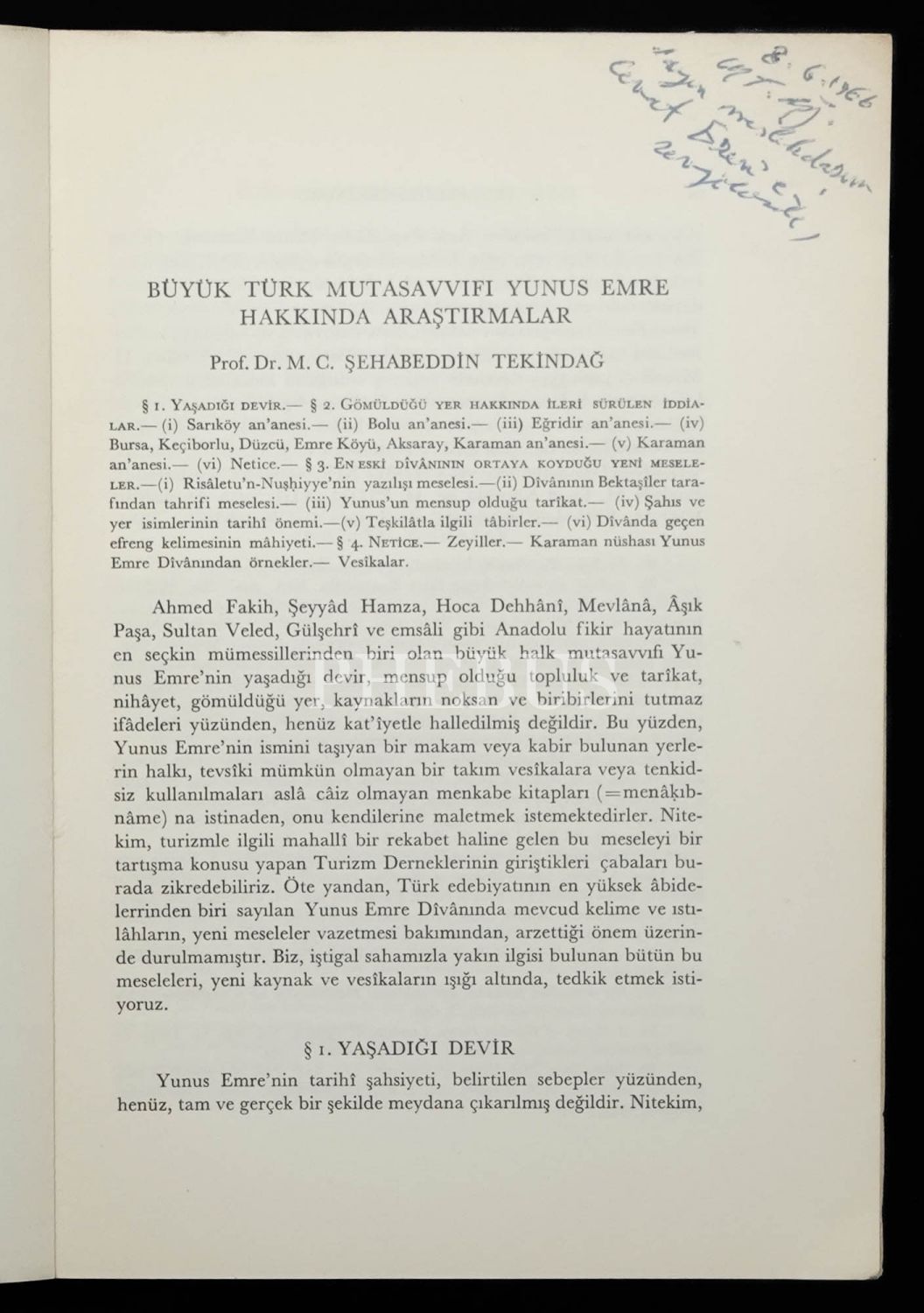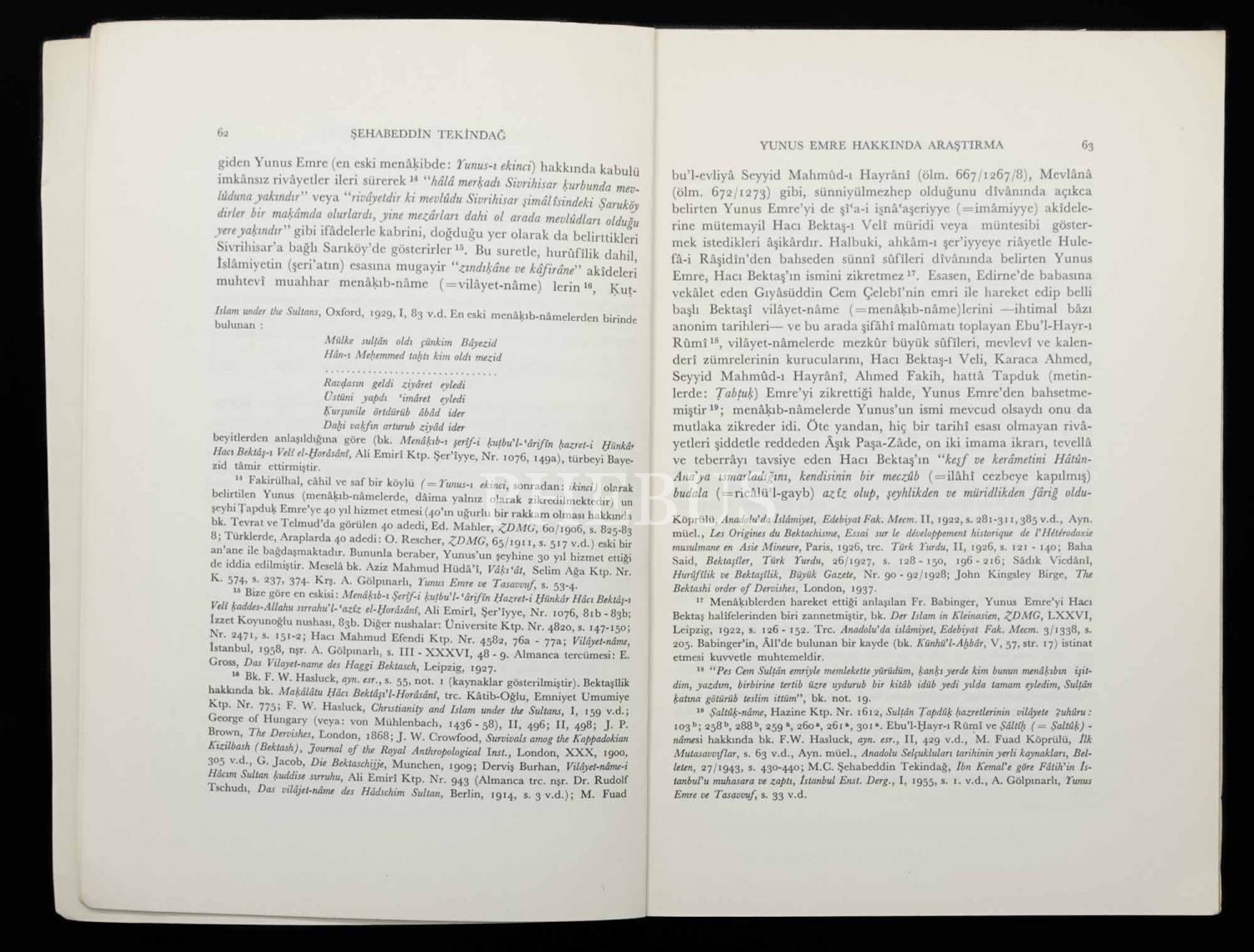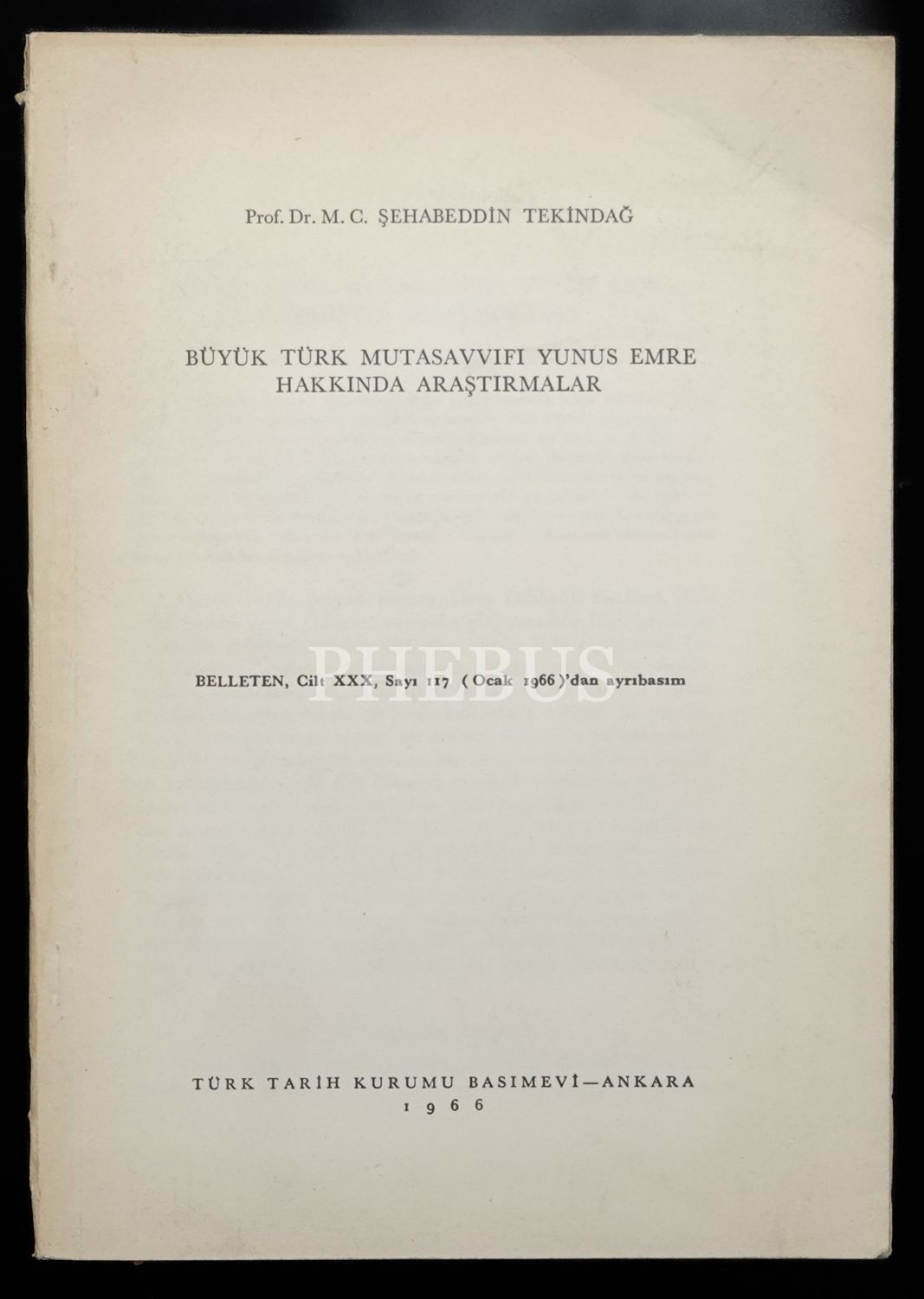 BÜYÜK TÜRK MUTAVASSIFI YUNUS EMRE HAKKINDA ARAŞTIRMALAR, Prof. Dr. M. C. Şehabeddin Tekindağ, 1966, Türk Tarih Kurumu Basımevi Ankara (Ayrı Basım), 59-90 sayfa aralığı, 17x24 cm...