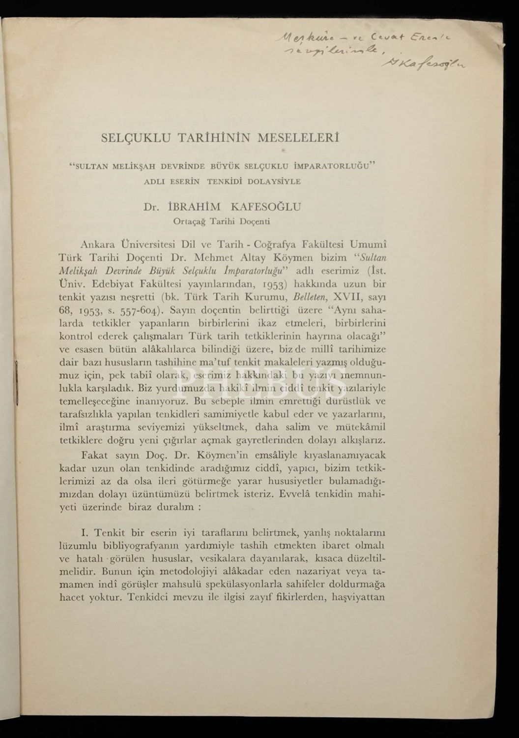 İbrahim Kafesoğlu´ndan Mefkûre ve Cevat Eren´e ithaflı...