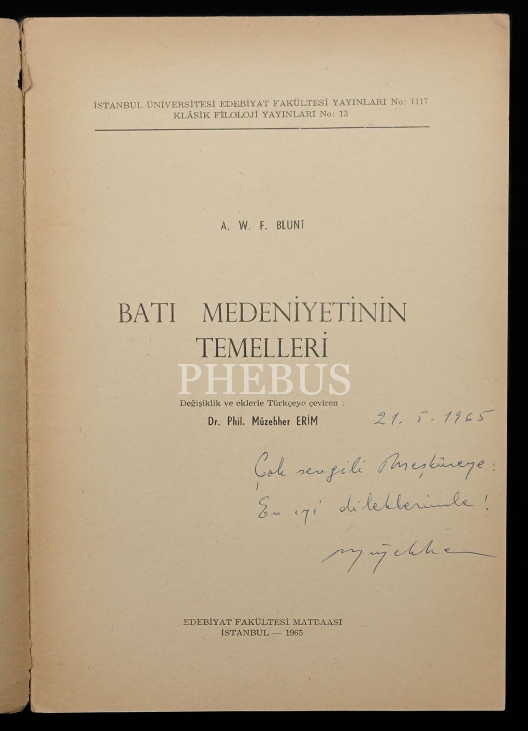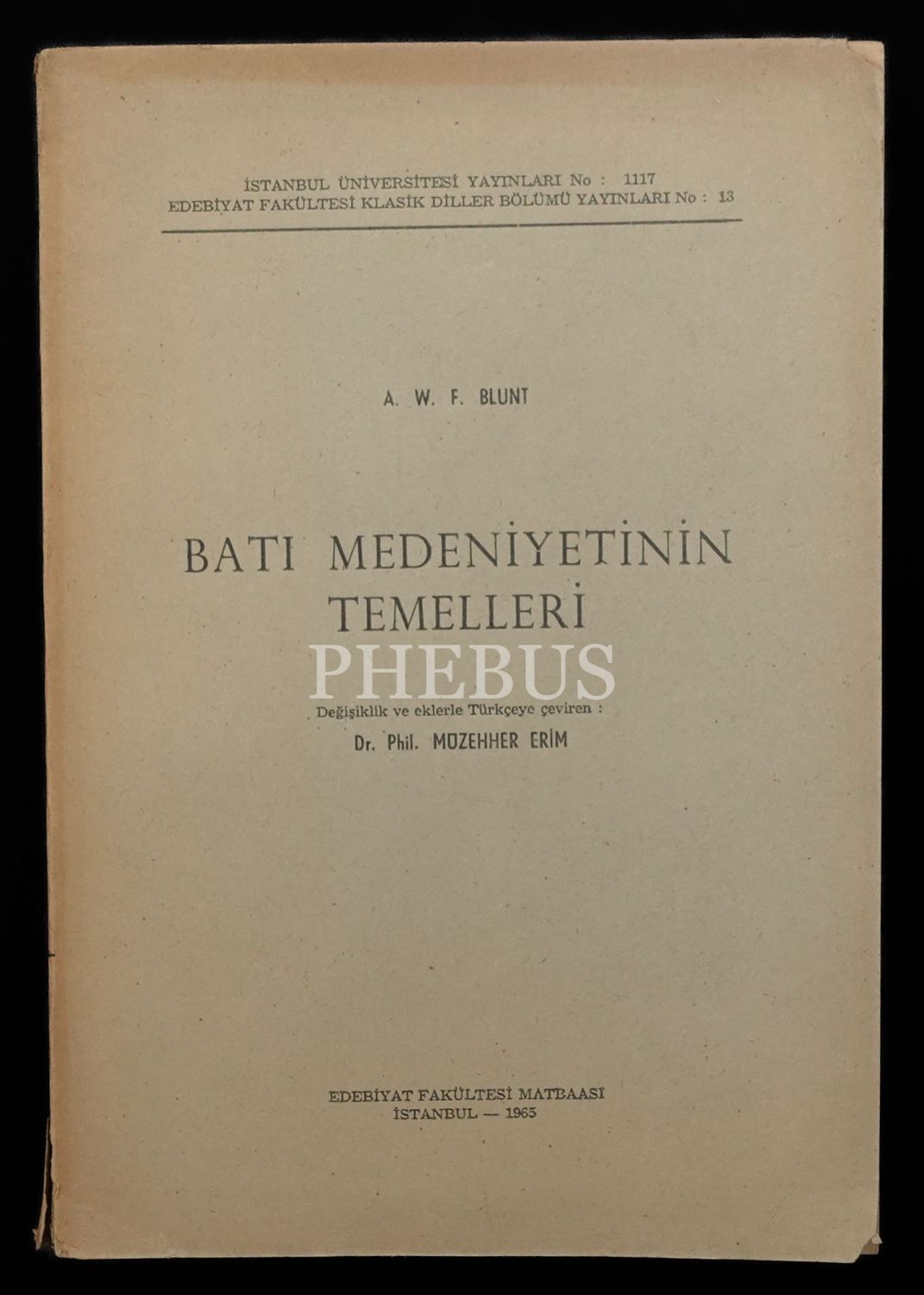 BATI MEDENİYETİNİN TEMELLERİ, A.W.F. BLUNT, çev: Dr. Phil. Müzehher Erim, 1965, İstanbul Edebiyat Fakültesi Matbaası, 166 sayfa, 17x25 cm...