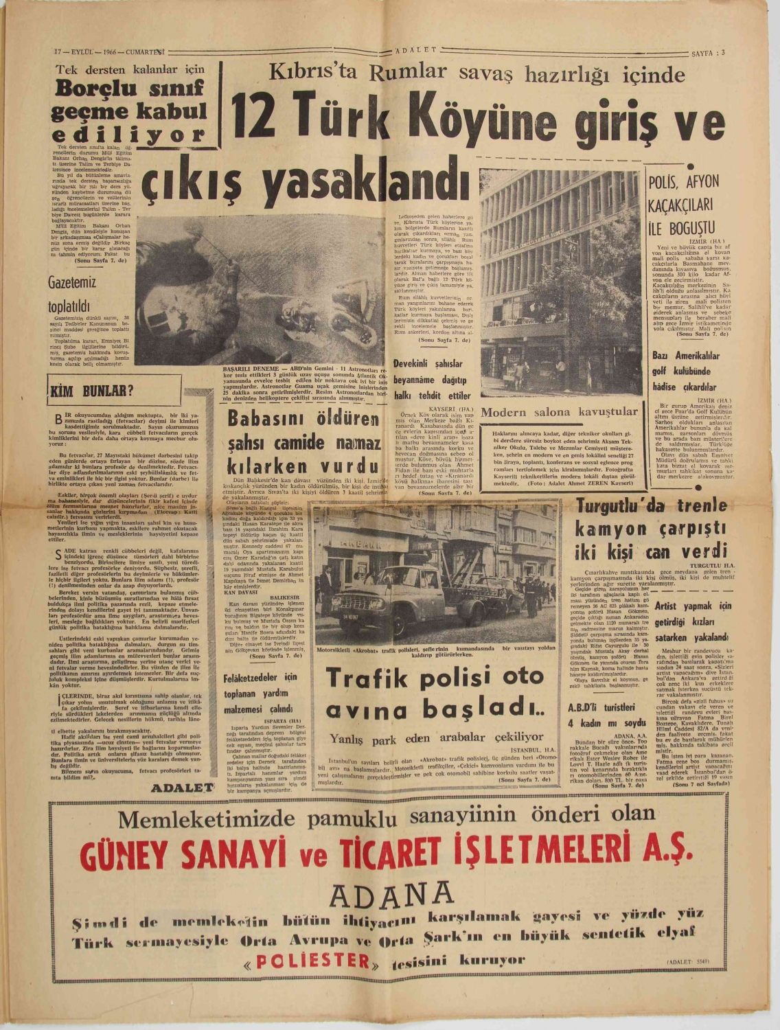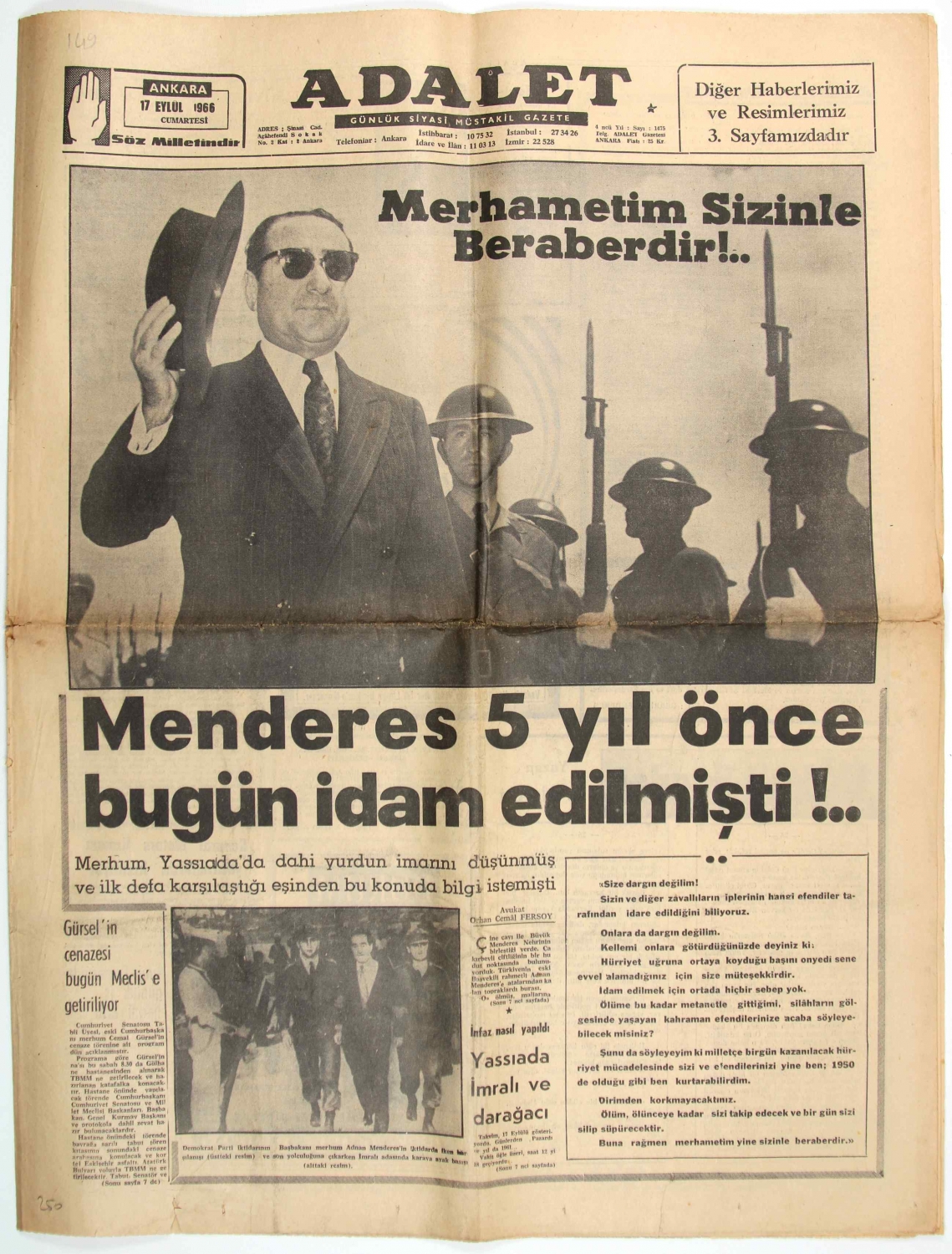 Adalet gazetesi, 1966, manşet "Menderes 5yıl Önce Bugün İdam Edilmişti!.."