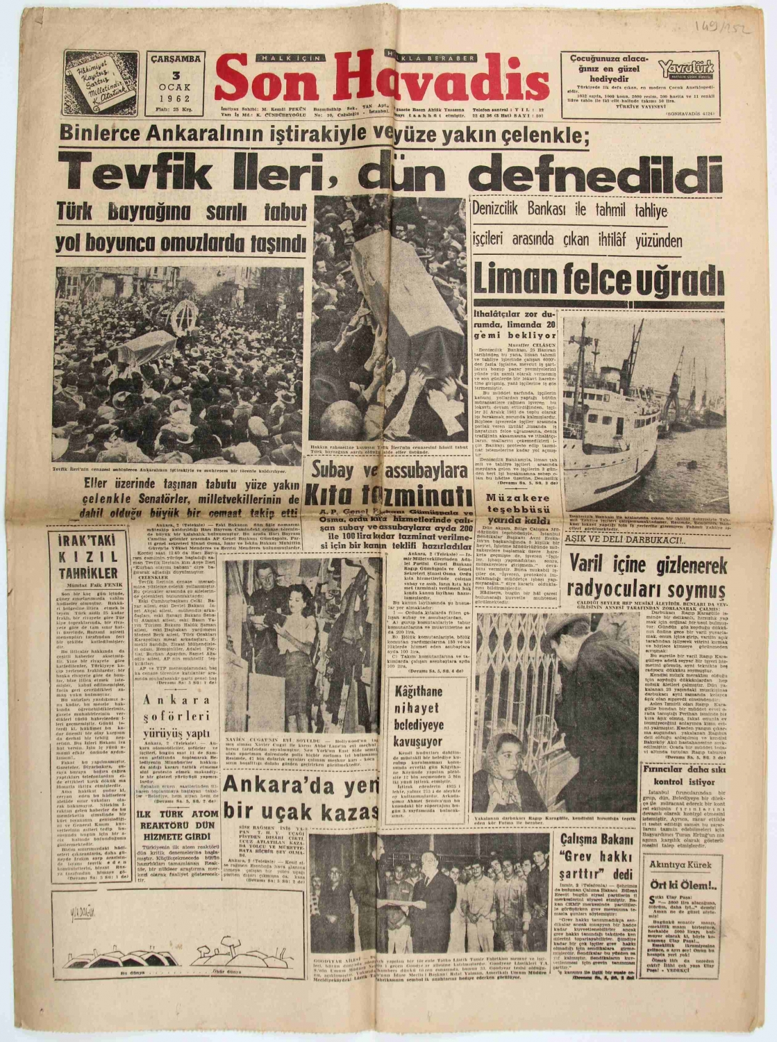 Son Havadis gazetesi, 1962, "Tevfik İleri Dün Defnedildi", 4 sayfa, 42x60 cm