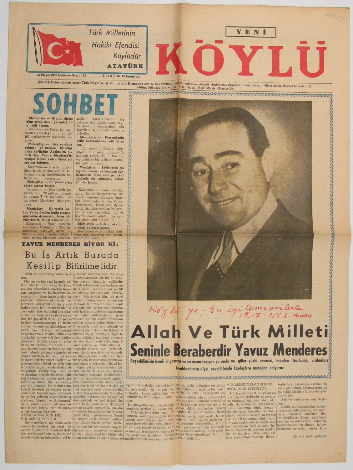Yeni Köylü Gazetesi, 1960, " Allah ve Türk Milleti Seninle Beraberdir Yavuz Menderes", 2 sayfa, 45x60 cm