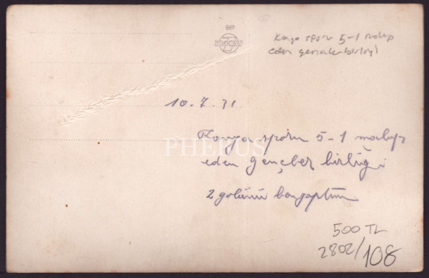 Konyasporu 5-1 mağlup eden Gençlerbirliği oyuncularının maç sonrası aldırdıkları 10 Temmuz 1931 tarihli toplu hatıra fotoğrafı, arka yüzü açıklamalı, 14x9 cm...