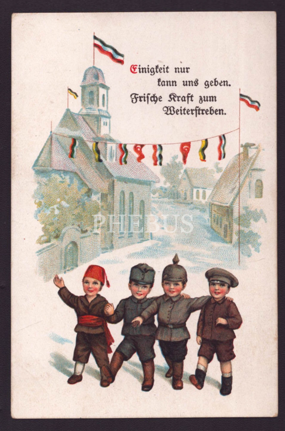 Müttefik devletlerin çocuk olarak resmedildiği İttifak kartpostalı, arka yüzü mektuplu, 9x14 cm...