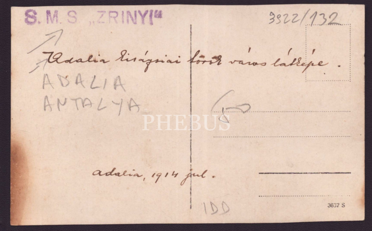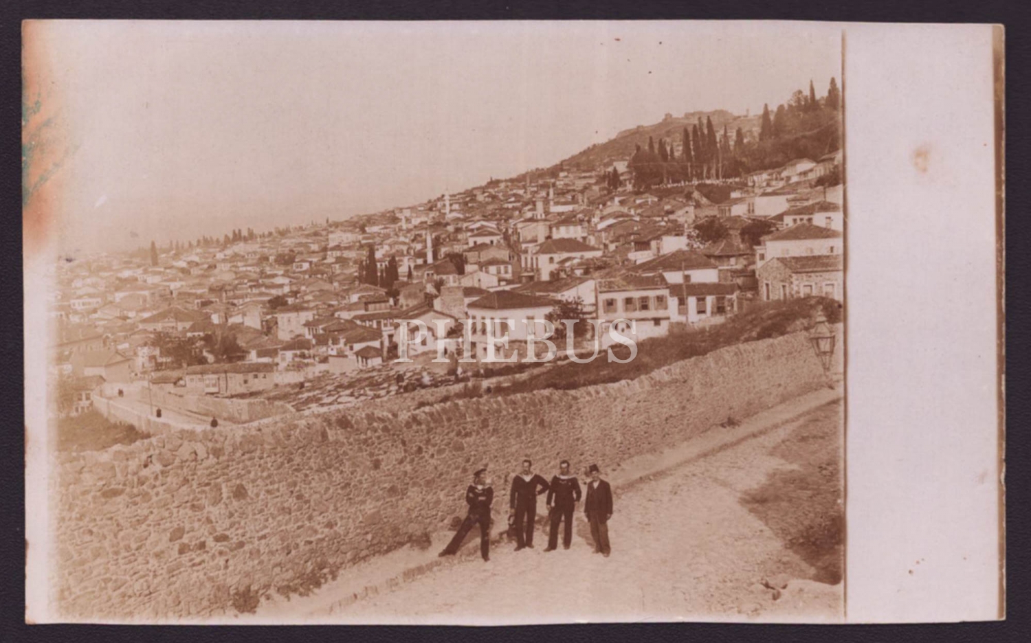 Yabancı denizcilerle birlikte "Adalia" (Antalya) manzarası önünde hatıra fotoğrafı çektiren fesli tip, 1914 tarihli, arka yüzü yabancı dilde açıklamalı, 14x9 cm...