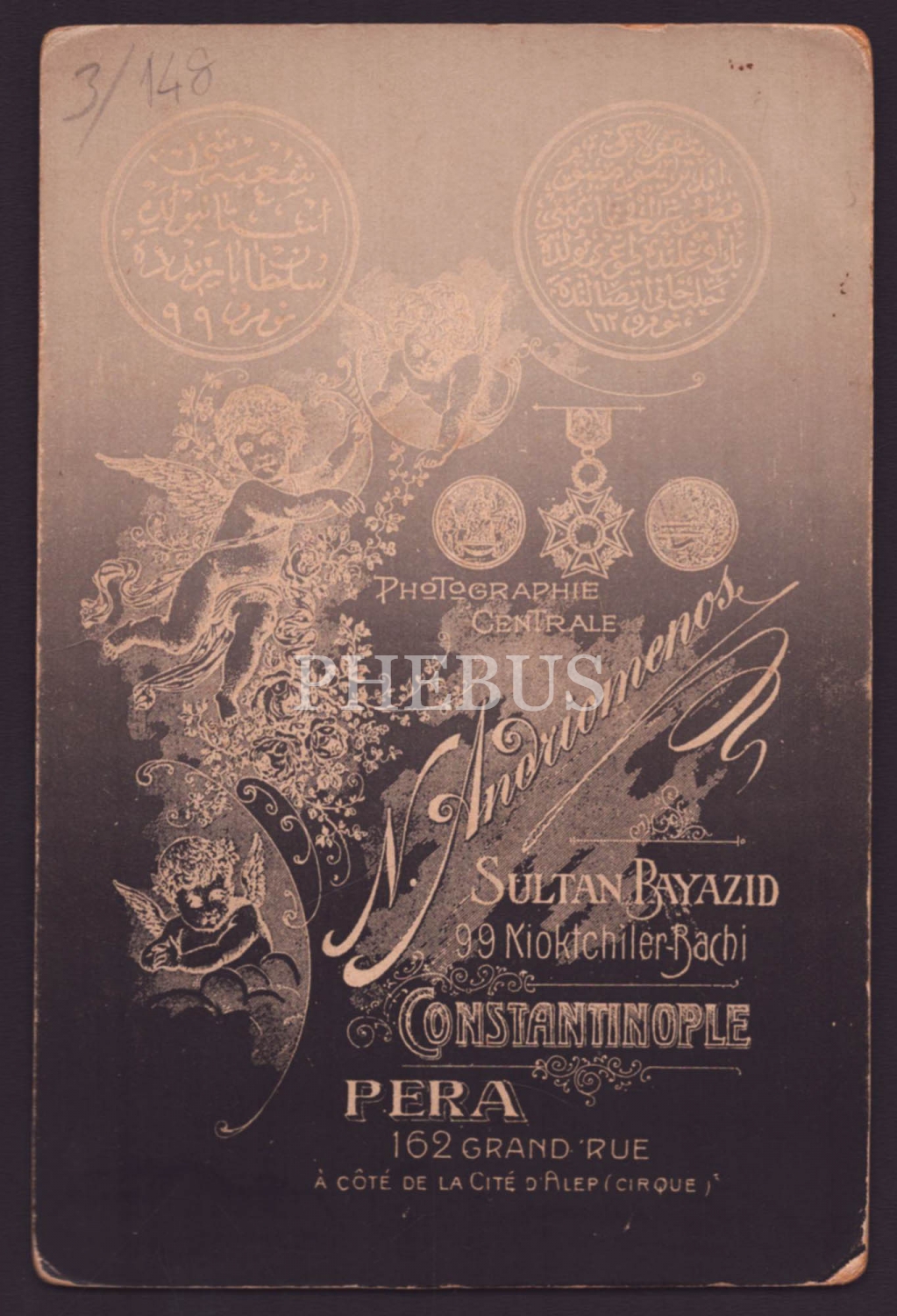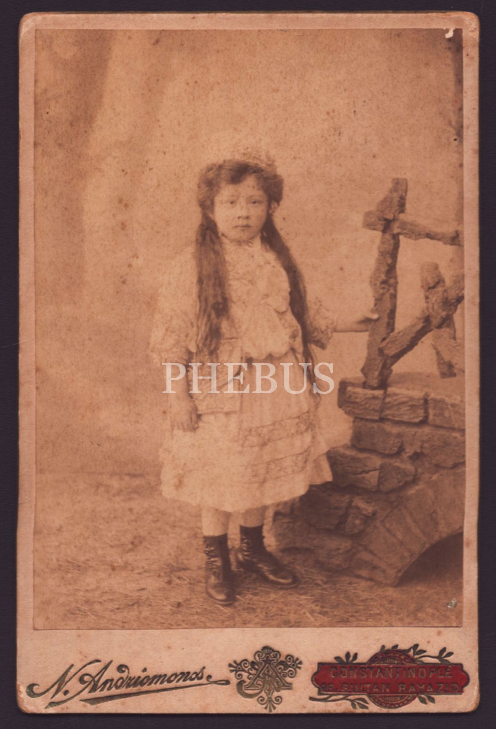 Cüz keseli minik kızın stüdyo kabin fotoğrafı, N. Andriomenos - Constantinople, 11x17 cm...