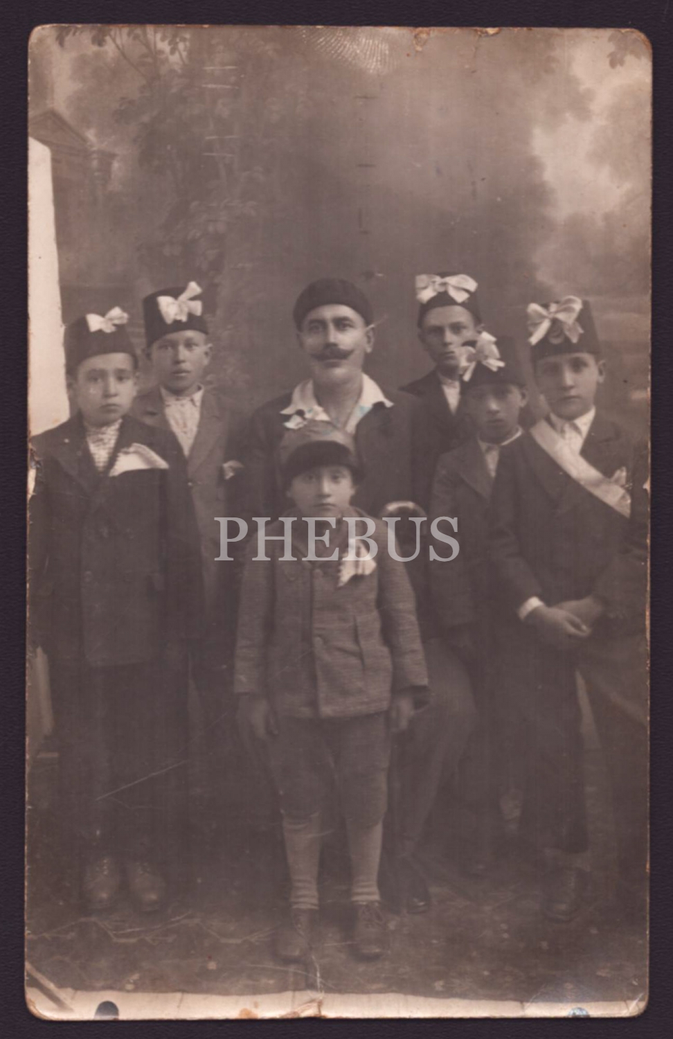 Feslerine fiyonklar bağlanmış mektepli çocuklarıyla hatıra fotoğrafı çektiren baba, 9x14 cm...