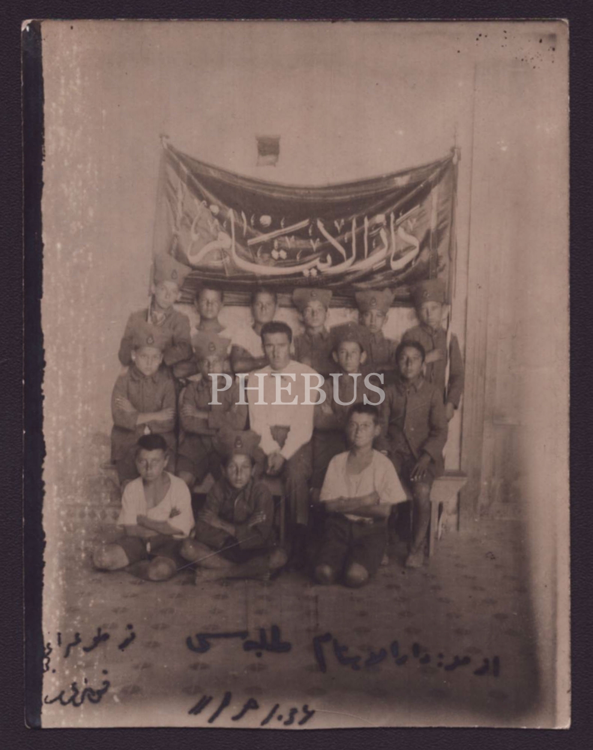 "İzmir Darüleytam(Yetimler Yurdu)" yazılı pankart önünde poz veren öğrencilerin toplu hatıra fotoğrafı, 12x9 cm...