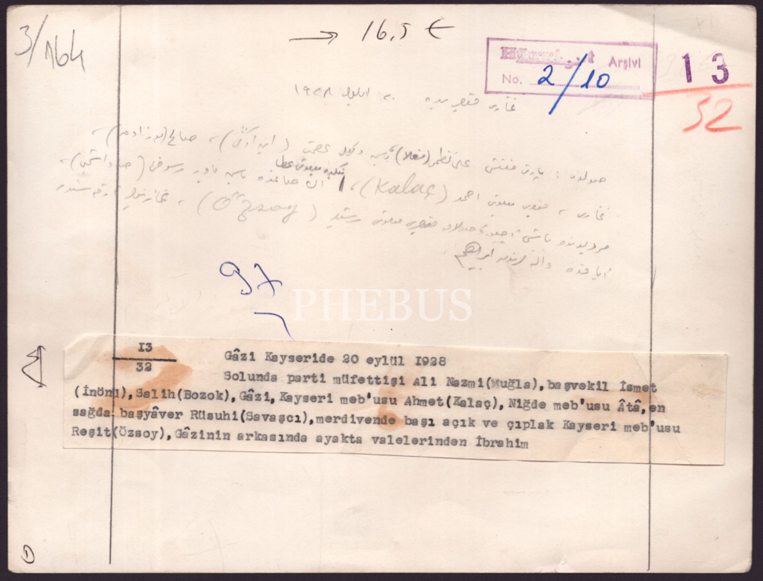 "Hürriyet Arşivi" damgalı fotoğrafın arka yüzünde eski ve yeni harflerle açıklama mevcuttur: "Gâzi Kayseride - 20 Eylül 1928, Solunda parti müfettişi Ali Nazmi (Muğla), Başvekil İsmet (İnönü), Salih (Bozok), Gâzi, Kayseri Meb´usu Ahmet (Kalaç), Niğde Meb´usu Âtâ, en sağda Başyâver Rüsuhi (Savaşçı), merdivende başı açık ve çıplak Kayseri Meb´usu Reşit (Özsoy), Gâzinin arkasında ayakta valelerinden İbrahim."