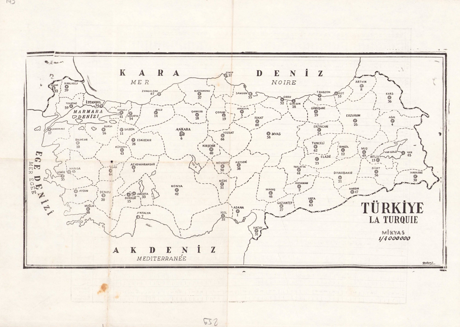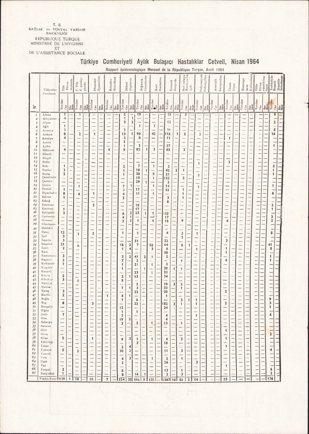 Türkiye haritası ve Türkiye Cumhuriyeti AYlık Bulaşıcı Hastalıklar Cetveli, Nisan 1964, 42x30 cm