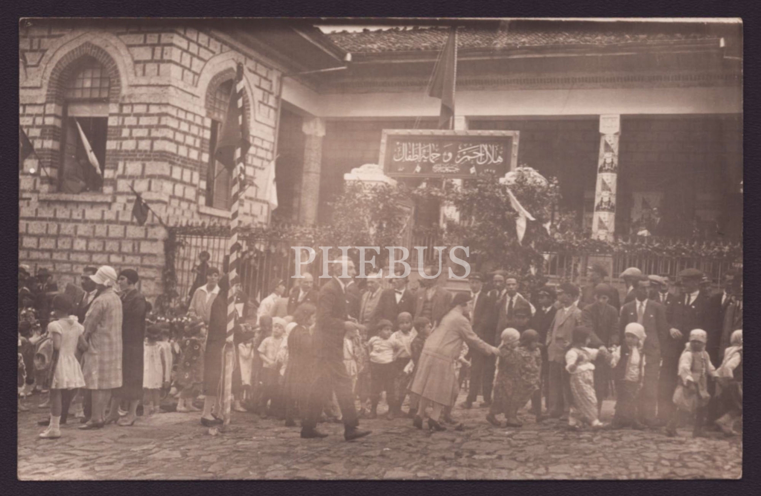 Hilal-i Ahmer ve Himaye-i Etfal Cemiyetleri binası önünde 23 Nisan 1928 kutlamalarından alınmış fotoğraf, 14x9 cm...